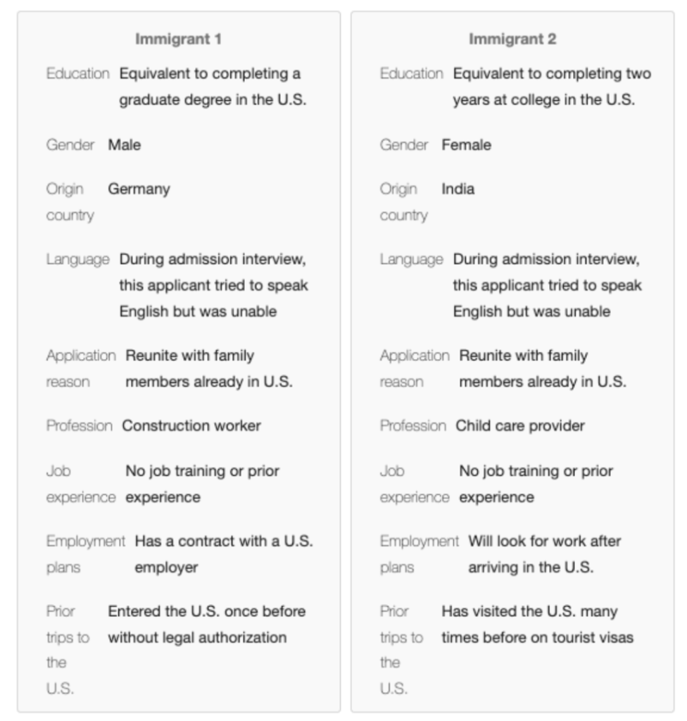 Each immigrant profile includes a diverse set of attributes like whether they have made prior trips to the U.S., country of origin, profession, education level, and gender. An example of what respondents might see is included below in figure 4. Importantly, each attribute in the profile has a set of distinct levels and each profile is randomly generated using these possible attribute values. In all, each respondent completed this exercise with 5 different pairs of immigrant profiles.