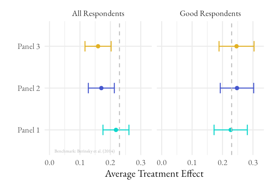 Our overall analytical approach is to compare average treatment effects among the full set of respondents to average treatment effects among the set of “good” respondents. The theory here is simple — if respondents are not paying attention to experimental treatments, the treatment effect should be biased towards zero. We also compare the average treatment effects from our survey to external benchmarks from peer-reviewed research articles. These benchmarks allow us to evaluate whether non-probability samples can replicate the direction and magnitude of effects.