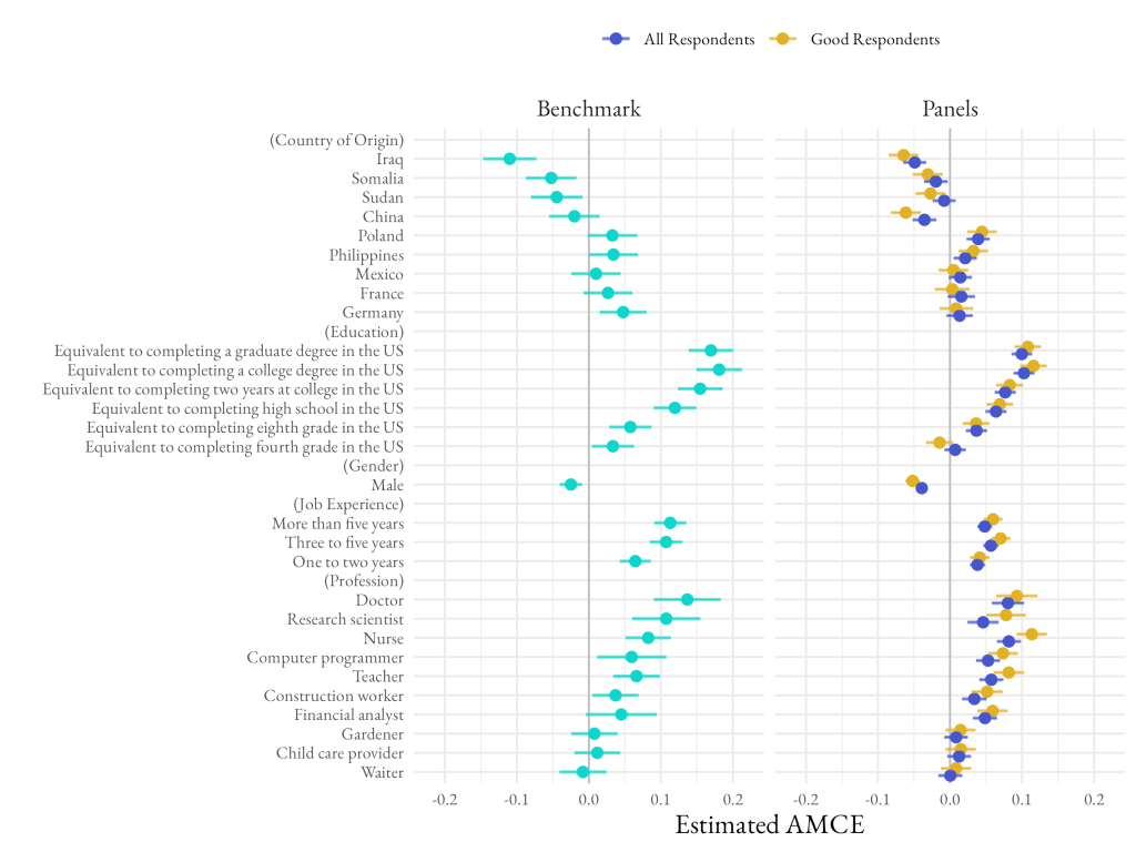 We find that among all respondents, only one of the 34 AMCEs has an opposite sign compared to the original paper, and that among good respondents all 34 AMCEs have the same sign. In experiment three, effect sizes among both all respondents and the subset of good respondents was somewhat lower than the effects reported in the original paper. Removing poor-quality respondents shrank the gap between our results and the published results by around 10%. Given that the original experiment was published nearly a decade ago and that immigration continues to be a salient political issue, it is understandable that we find some difference in the effect size, but here again we see that the effects are larger among the good subset than among the set of all respondents.