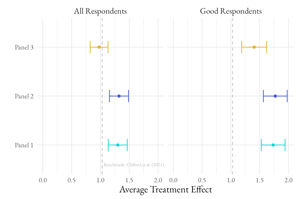 Similar to experiment one, we see a statistically significant effect in the same direction as the original paper among the full set of respondents in each of the three panels. After removing low-quality responses, the treatment effect is 30 to 43% larger. It is worth noting that the benchmark survey from Clifford et al. (2021) also used an online non-probability panel. It is possible that had the authors had better tools for removing poor quality respondents, their effect sizes might have been significantly larger than reported.