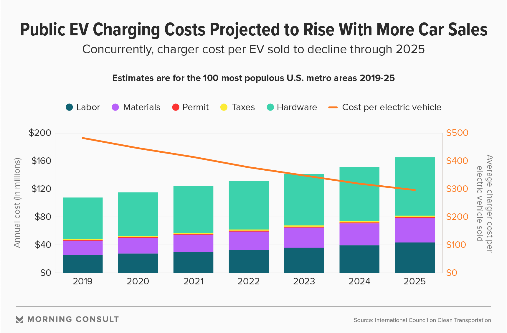 While Nicholas projects the total cost of public and workplace charger infrastructure to increase each year from 2019 to 2025 as electric vehicle sales increase, the average charger cost for each new electric vehicle sale is estimated to decline from $480 in 2019 to $300 by 2025, the report states.