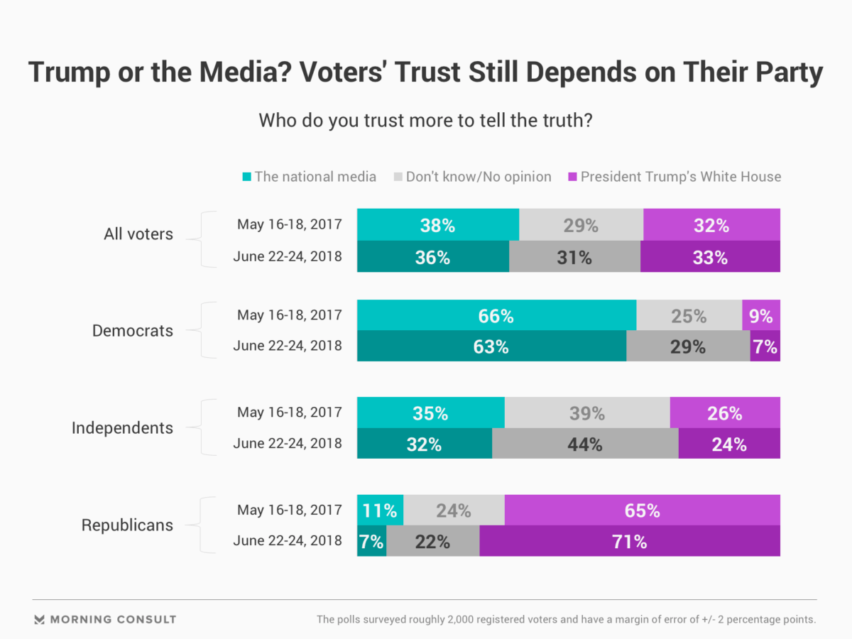 A new Morning Consult/Politico poll found that the share of Republican voters who believe the national political media will tell the truth dropped 4 percentage points to 7 percent since a May 16-18, 2017 survey, while their trust in Trump’s truth-telling rose 6 points, to 71 percent.