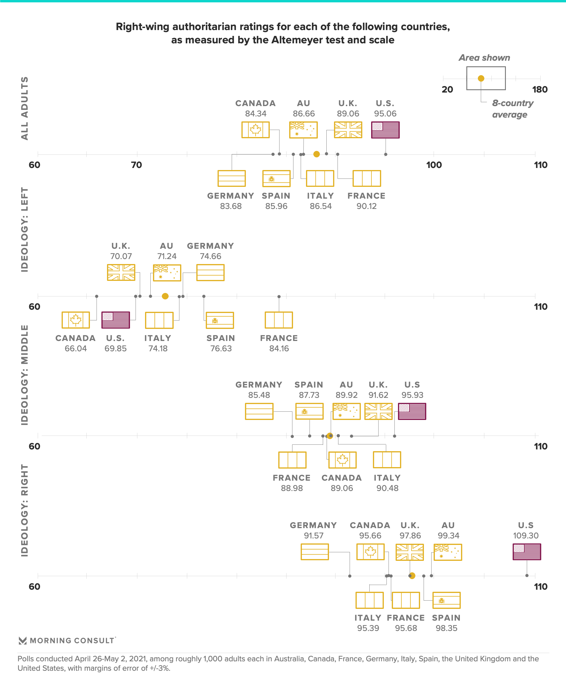 Morning Consult was further interested in understanding how the prevalence of RWA in the United States compared to its counterparts. To examine this, 1,000 adults were surveyed in each of the following countries: the United Kingdom, Canada, Australia, Italy, Spain, Germany and France. These samples were weighted to approximate a target sample of adults based on gender, educational attainment, age and region. Results from these full surveys have a margin of error of +/- 3 percentage points.