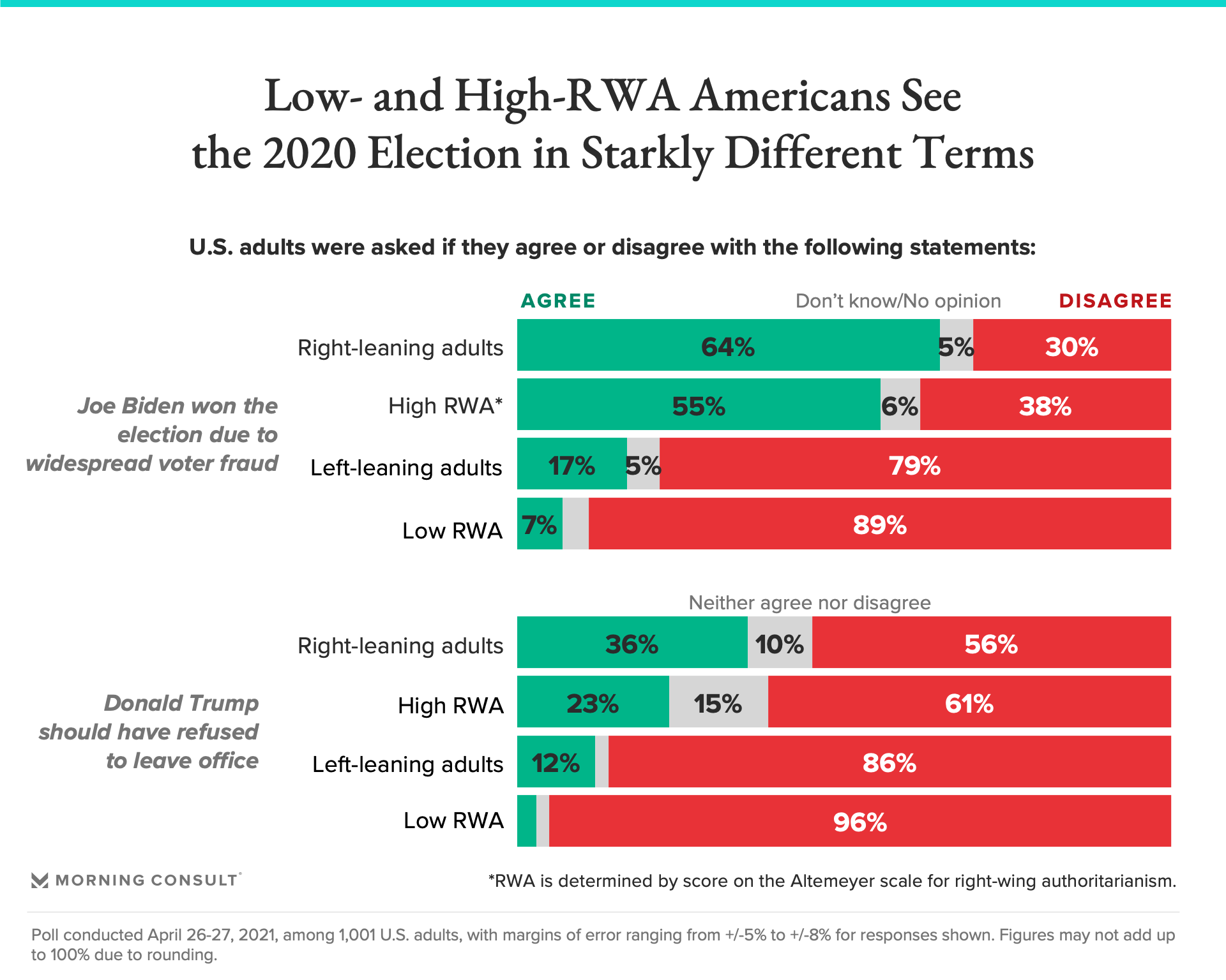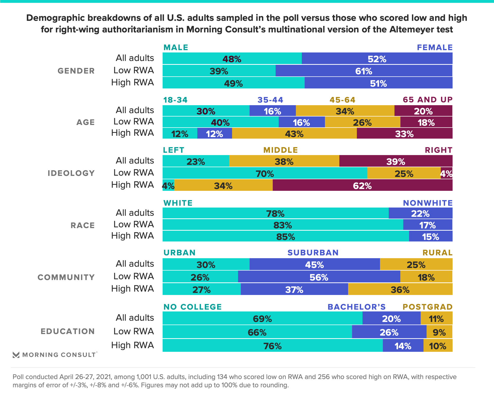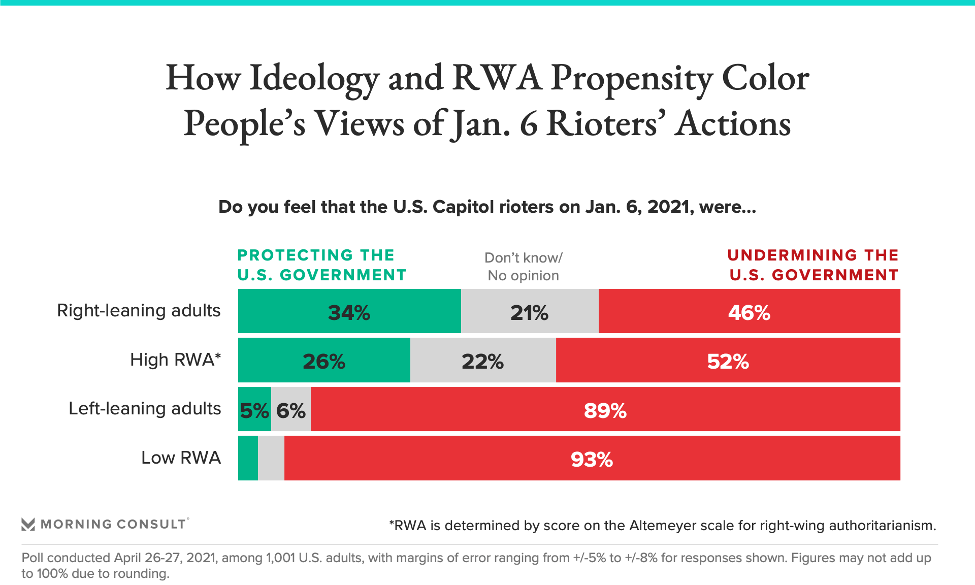 Following the Jan. 6 insurrection at the U.S. Capitol, Morning Consult was interested in better understanding the nature of right-wing authoritarianism (RWA). More specifically, how are people who hold strong RWA beliefs different from those who don’t? Do people with strong RWA beliefs have different perceptions of major events such as the insurrection, the coronavirus pandemic and the 2020 presidential election than those who do not hold these RWA beliefs? To examine this, 1,001 adults were surveyed in the United States. This sample was weighted to approximate a target sample of adults based on gender, educational attainment, age, race and region. Results from the full survey have a margin of error of +/- 3 percentage points.