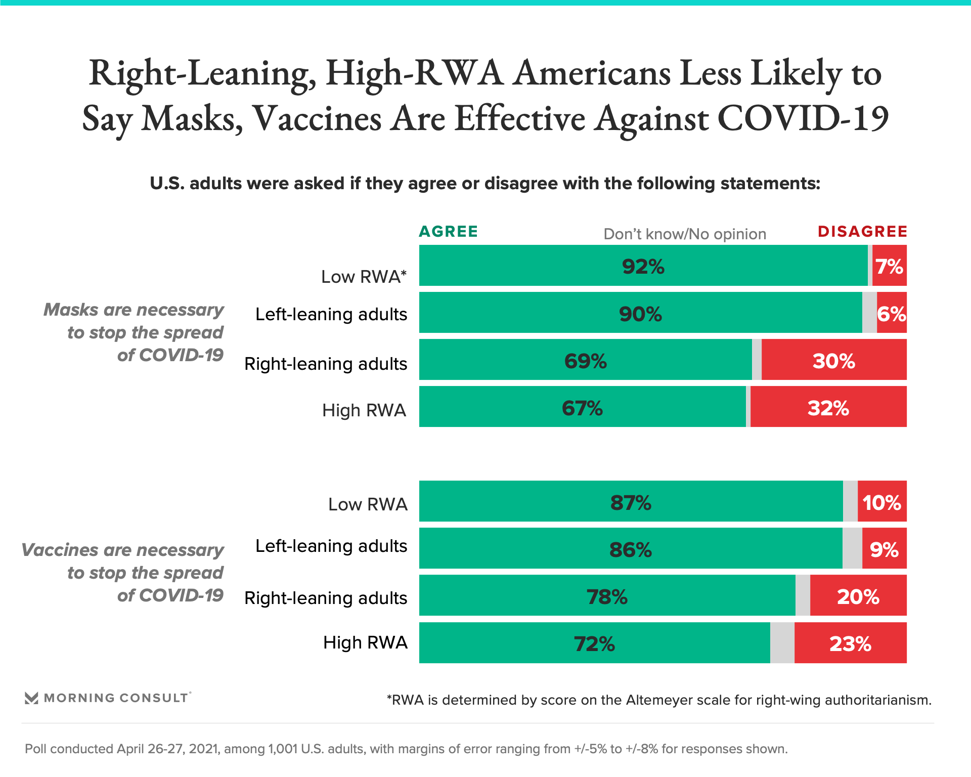 Right-leaning adults reported similar views as those who are high in RWA, whereas left-leaning adults reported similar views as those who are low in RWA.