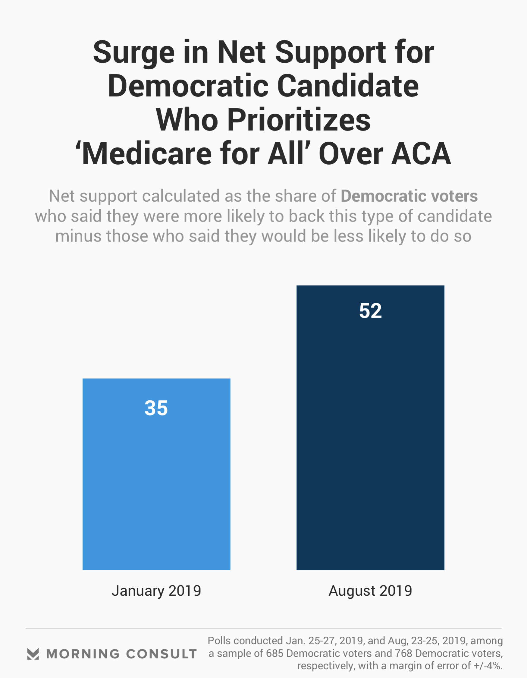 Net support for a candidate that supports ‘Medicare For All’ over building on the ACA was at 52 points in August, up from 35 points in January