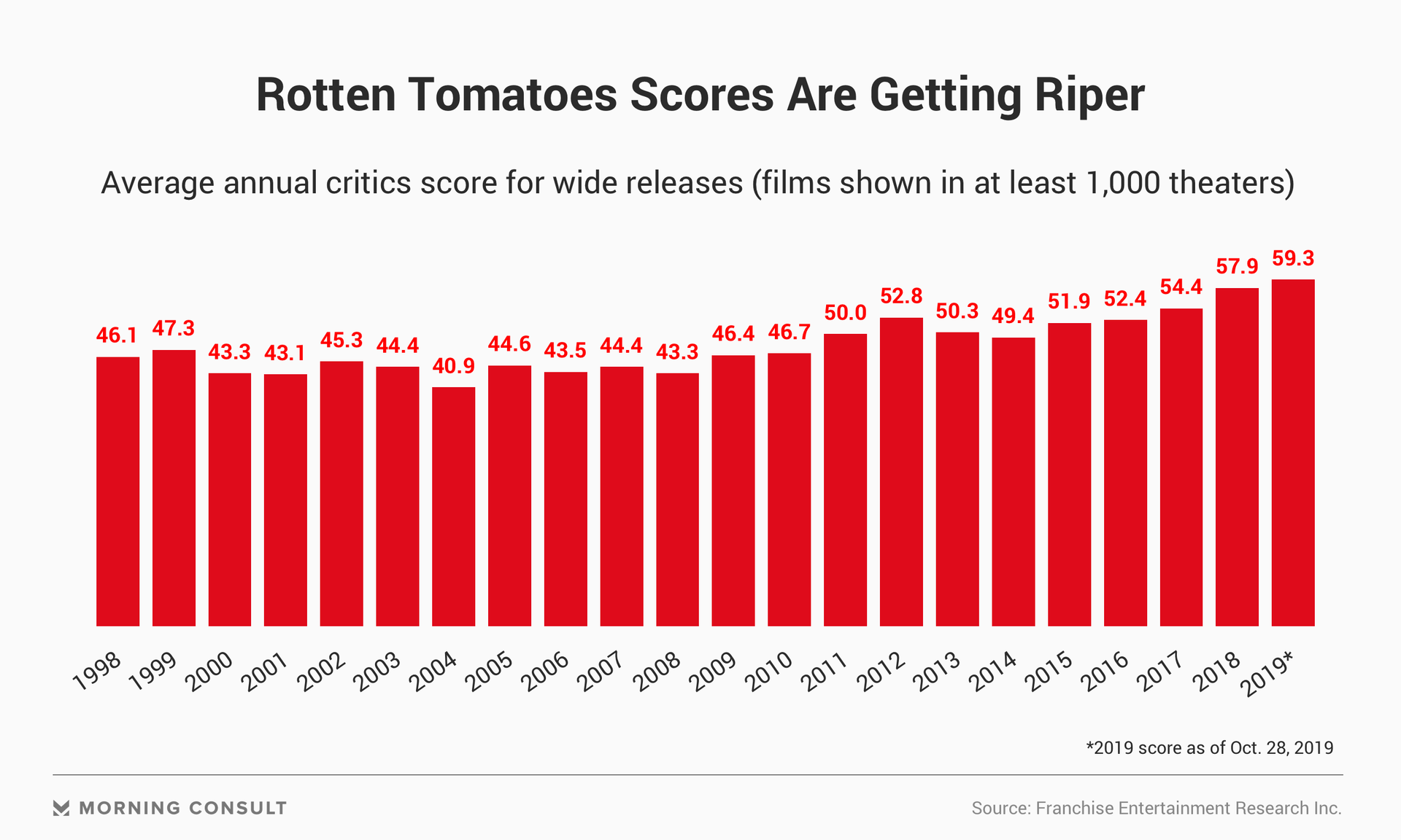 David A. Gross, a movie consultant that runs Franchise Entertainment Research Inc., found that scores for wide-release films have been fluctuating since 1998’s recorded average of 46. However, averages have been increasing every year since 2014, with this year’s average coming in at 59.3, as of Oct. 28, 1.4 points higher than 2018’s 57.9.