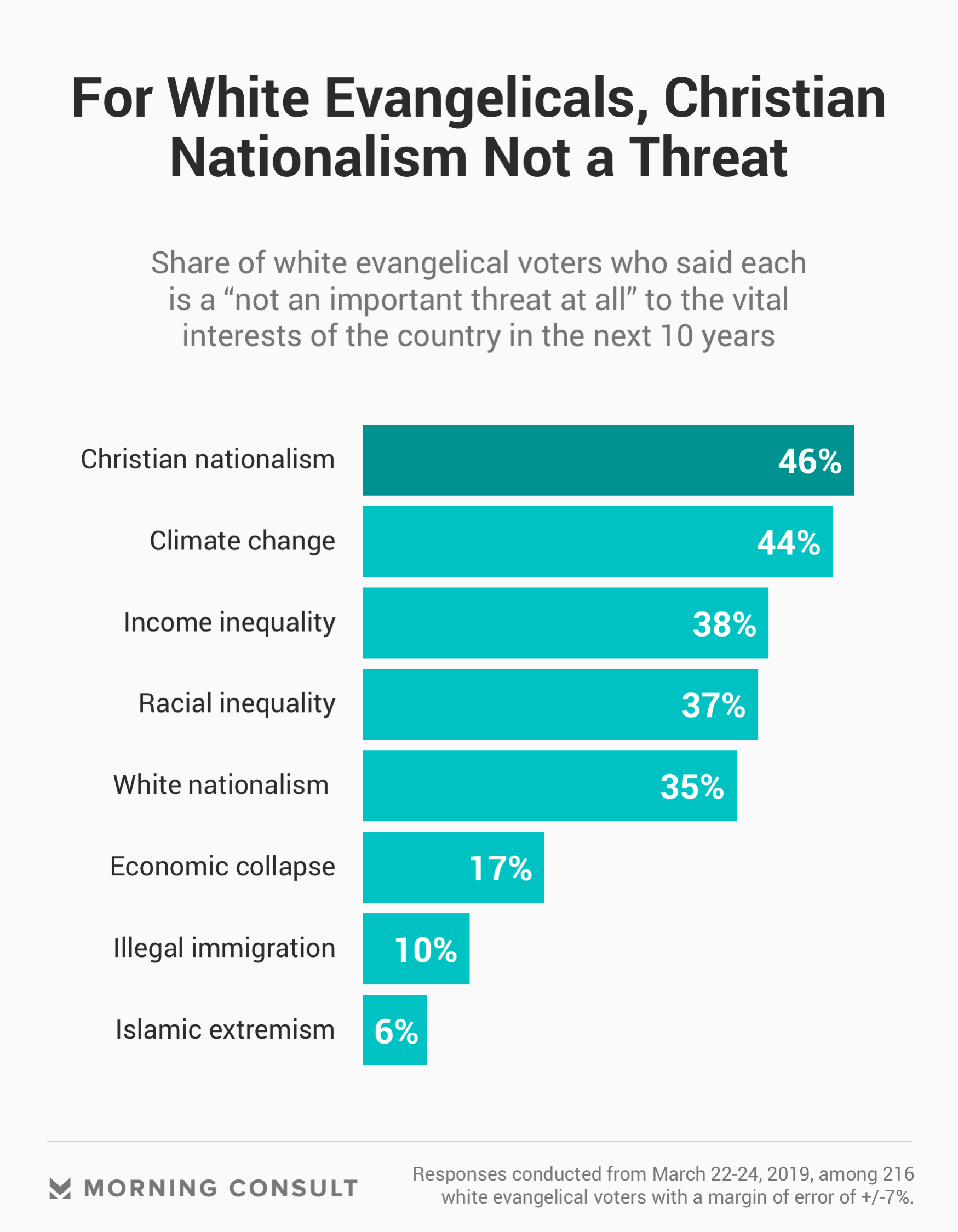 Nearly half of white evangelicals said Christian nationalism is not an important threat at all, roughly on par with their lack of concern about climate change.