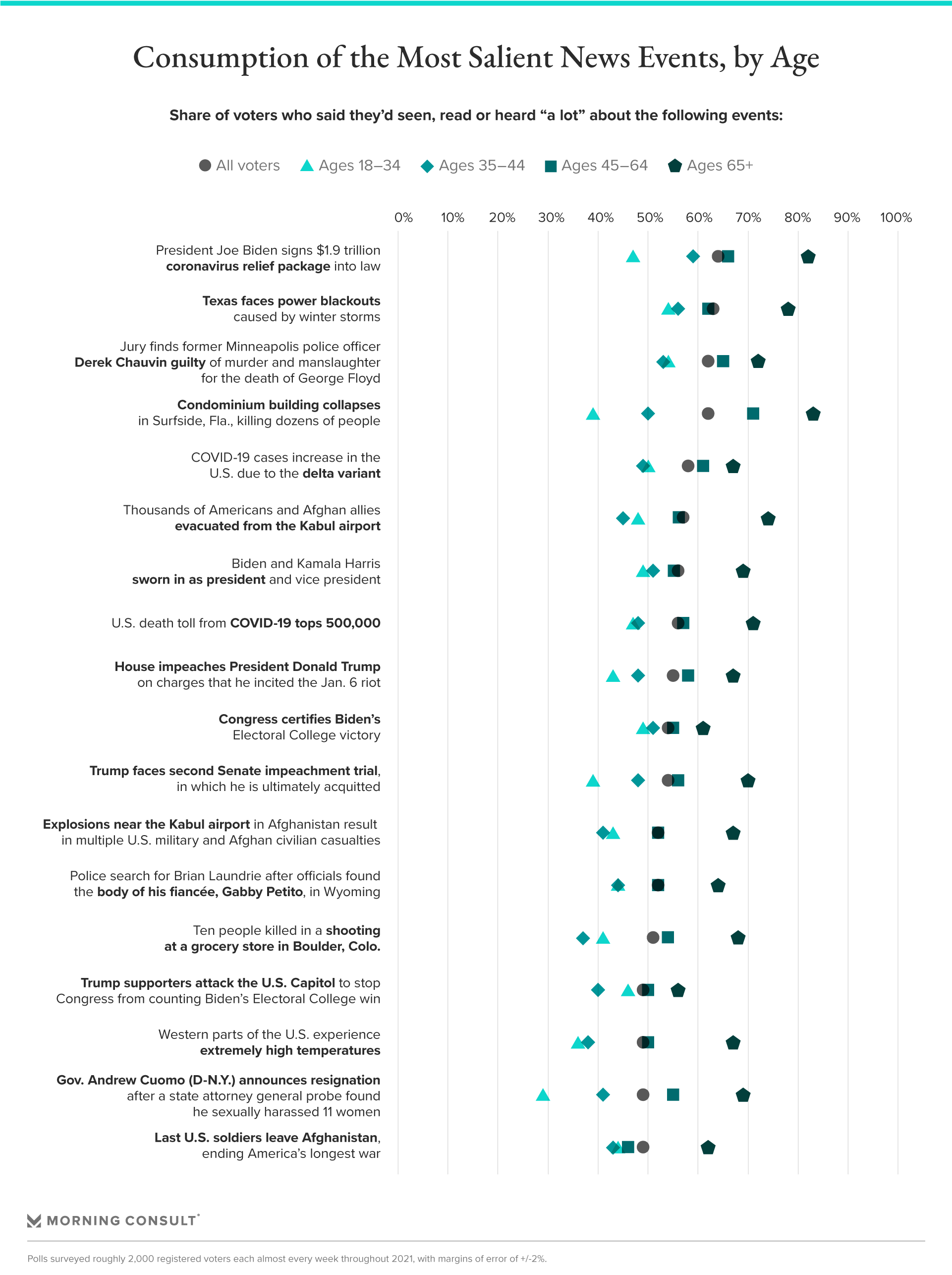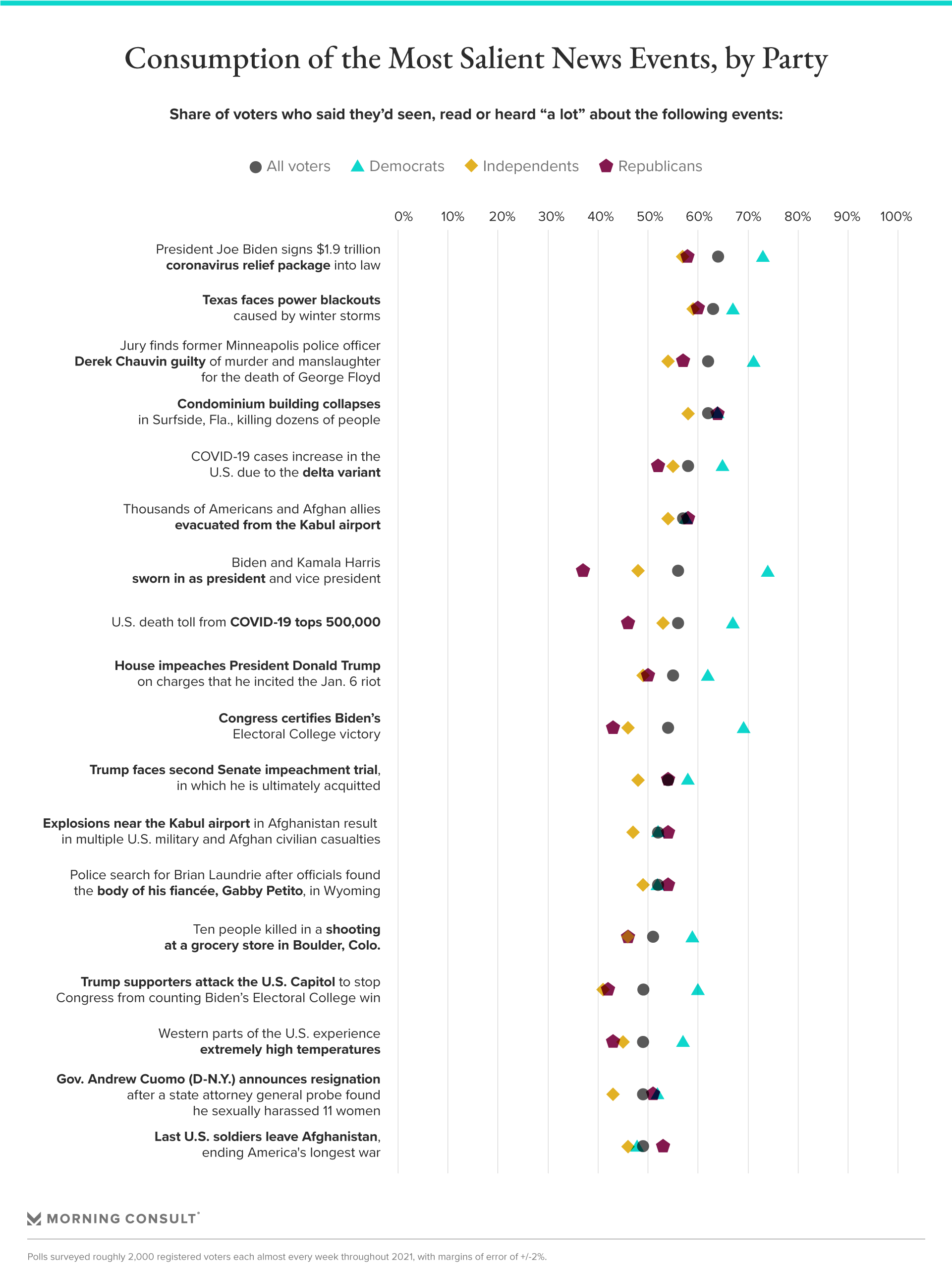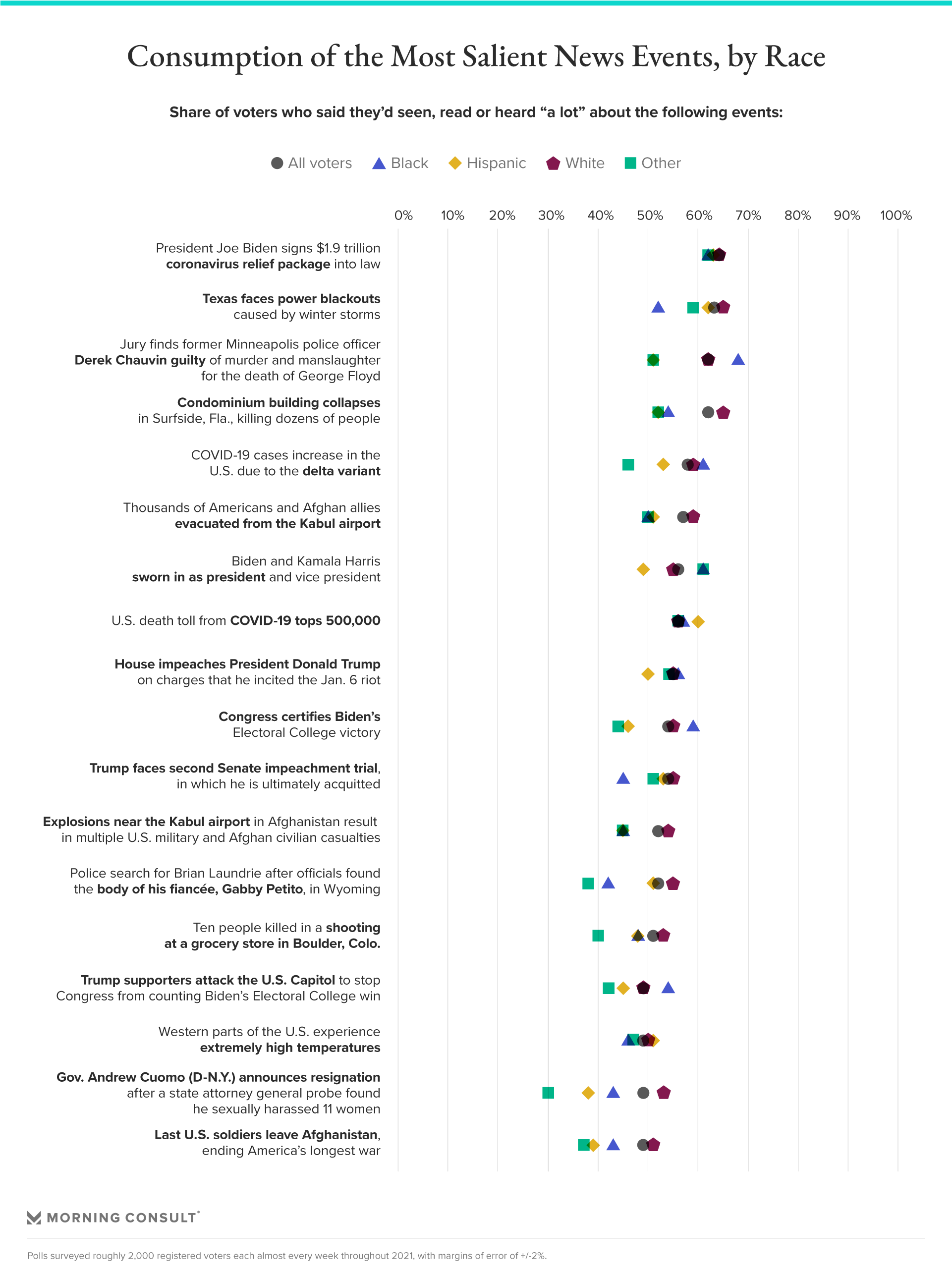 The extent to which these stories were consumed by voters was often determined by the same fissures of partisanship, age and race that permeate American society and its politics, according to findings from 52 Morning Consult surveys conducted throughout 2021, which asked Americans how much they had seen, read or heard about a range of news events unfolding at the time. (See the full interactive here.)