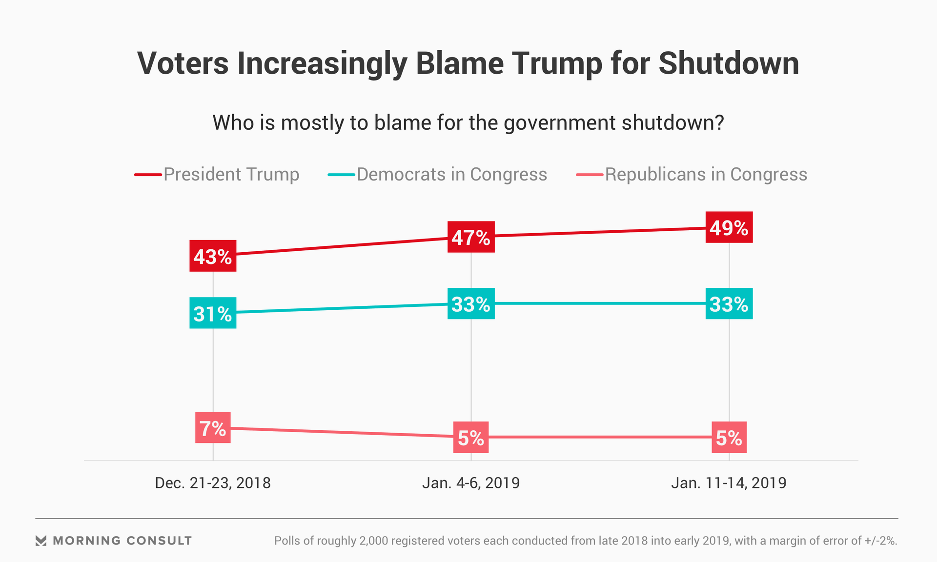 In the new Morning Consult/Politico survey of 1,984 registered voters, conducted Jan. 11-14, 49 percent said they mostly blamed the president for the ongoing impasse, which has resulted in the shuttering of roughly one-fourth of the federal government. That figure is up 6 percentage points since Morning Consult’s first survey on the topic, conducted around the time the shutdown began on Dec. 22.