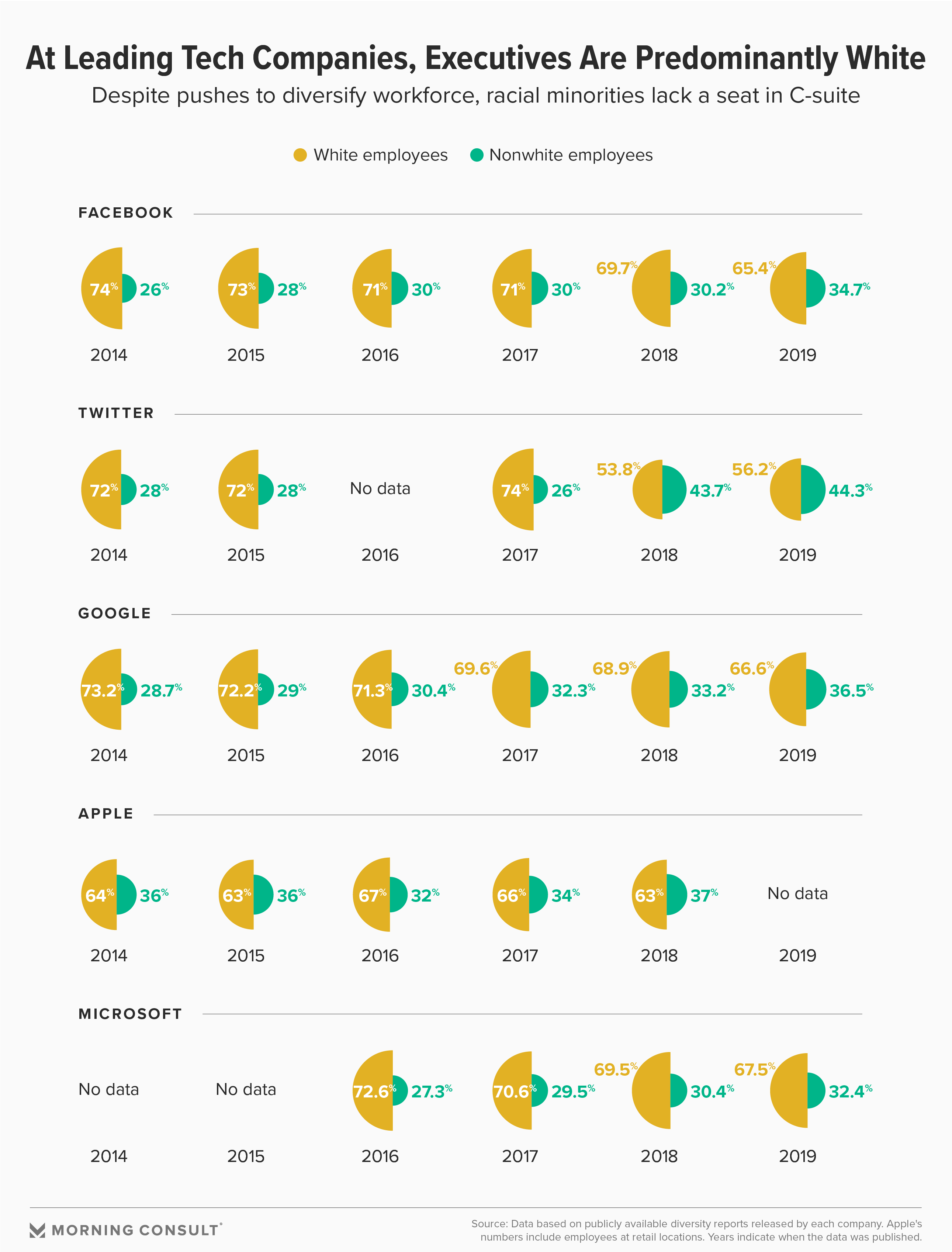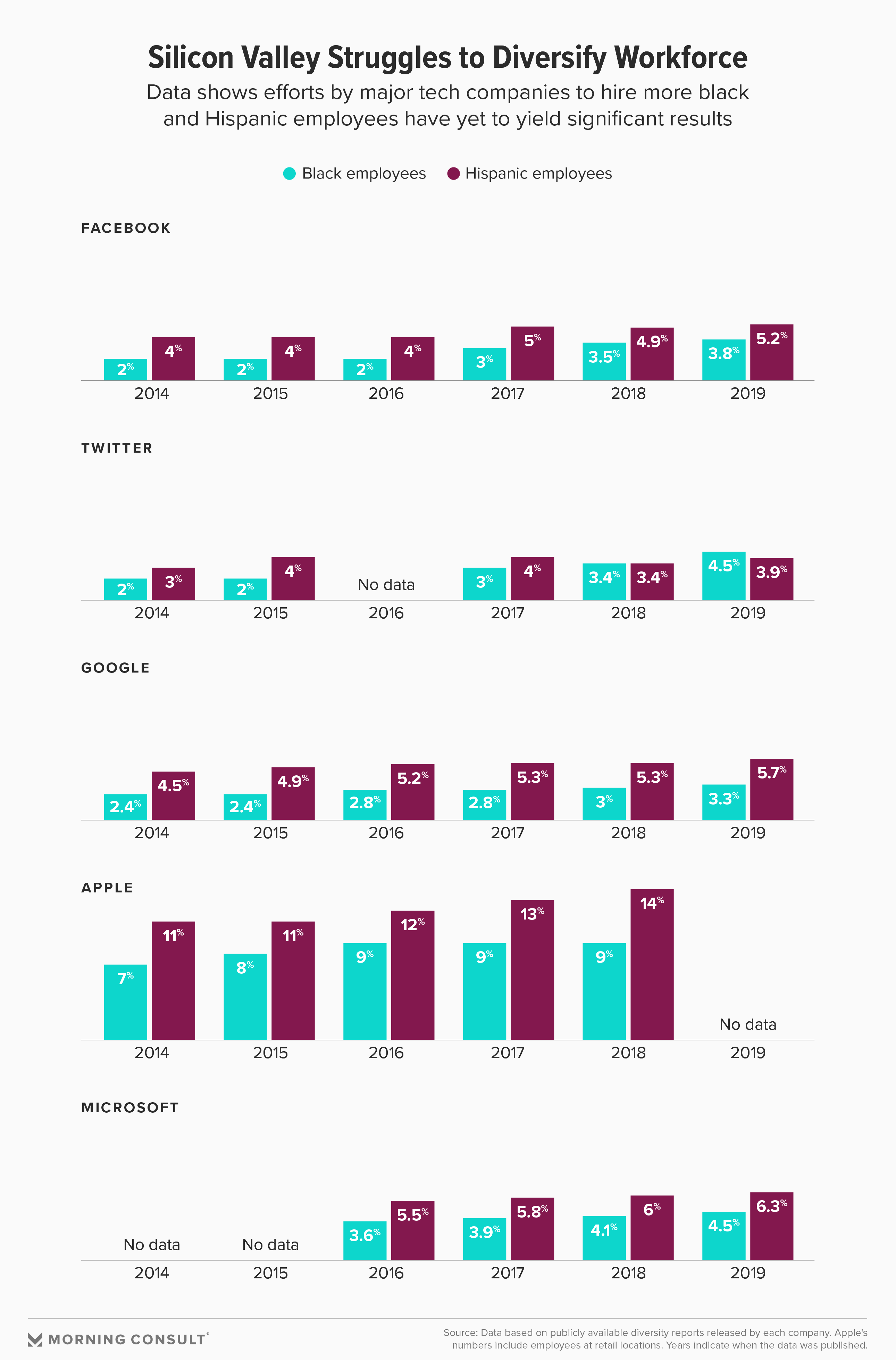 Since 2014, black employees have made up less than 5 percent of the workforces at Facebook, Twitter, Google and Microsoft Corp., according to a Morning Consult analysis of the companies’ annual diversity reports. At Apple Inc., black employees comprise 9 percent of the company as of 2018, the company’s latest available data, though that figure also encompasses workers at Apple’s retail locations.