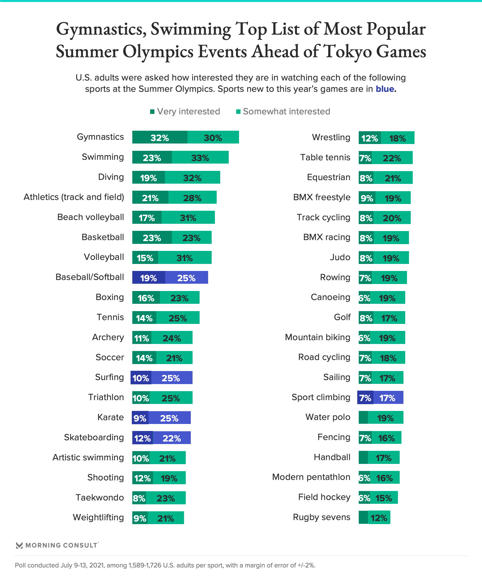 In addition, respondents indicated that they are more likely to watch gymnastics than any other sport at this summer’s Olympics, with 62 percent of U.S. adults expressing interest. Swimming (56 percent), diving (51 percent), track and field (49 percent) and beach volleyball (48 percent) rounded out the top five most popular sports heading into the games.