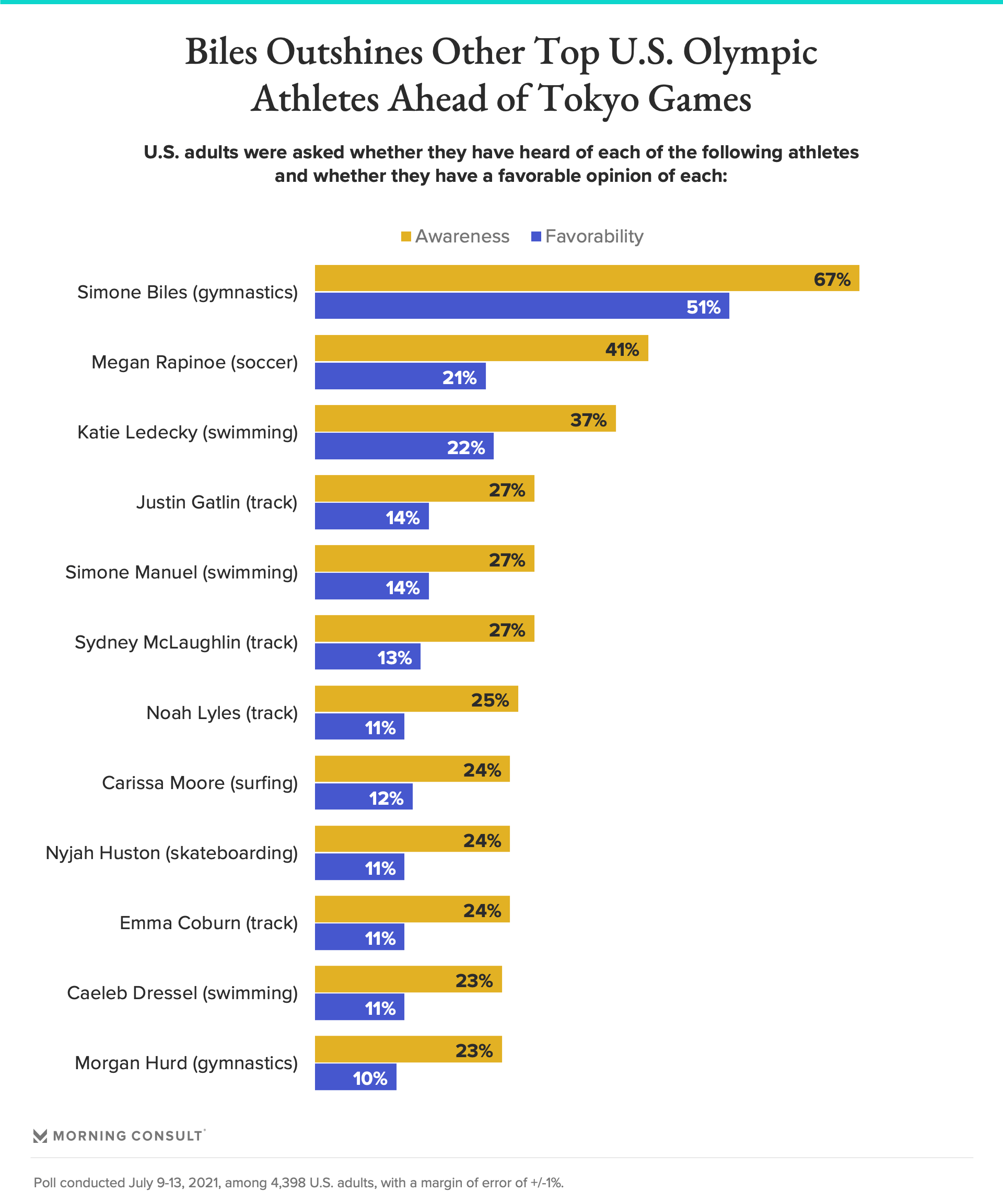 Biles’ star is poised to reach new heights in Tokyo, where she will be the center of attention among the American delegation. In Morning Consult’s most recent pre-Olympic survey, conducted July 9-13, 2 in 3 U.S. adults indicated they had heard of Biles, making her the most well-known Olympic athlete among more than a dozen included in the survey. By comparison, 41 percent of respondents indicated they had heard of Megan Rapinoe, captain of the U.S. women’s soccer team, and 37 percent had heard of decorated swimmer Katie Ledecky.