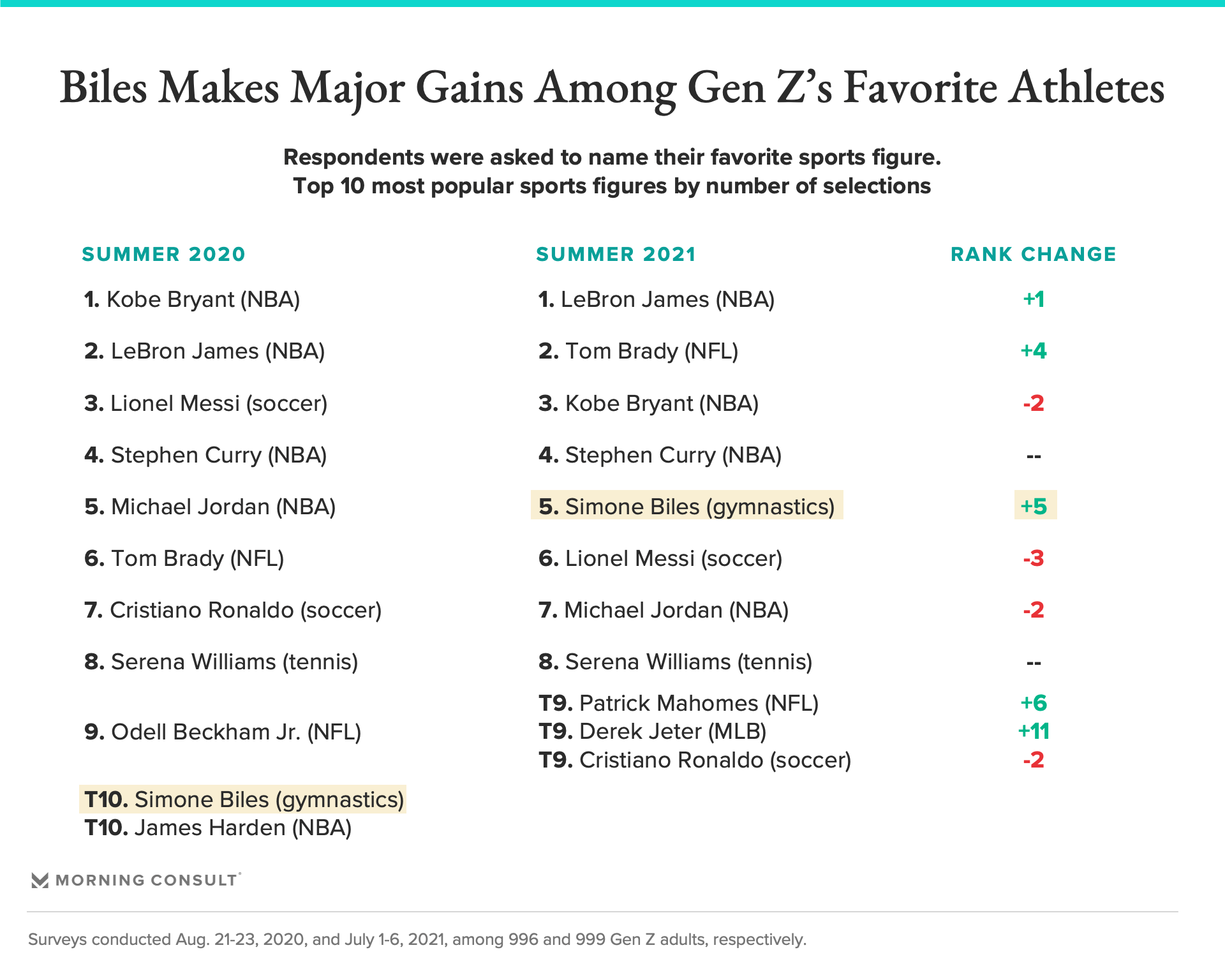 In a coinciding survey of 999 Gen Z adults, the 24-year-old Biles garnered 4 percent of the 471 valid responses, placing her fifth. James (9.3 percent) was the most popular athlete among the younger set, followed by Brady (6.8 percent), late basketball Hall of Famer Kobe Bryant (6.4 percent) and Golden State Warriors guard Stephen Curry (5.5 percent).