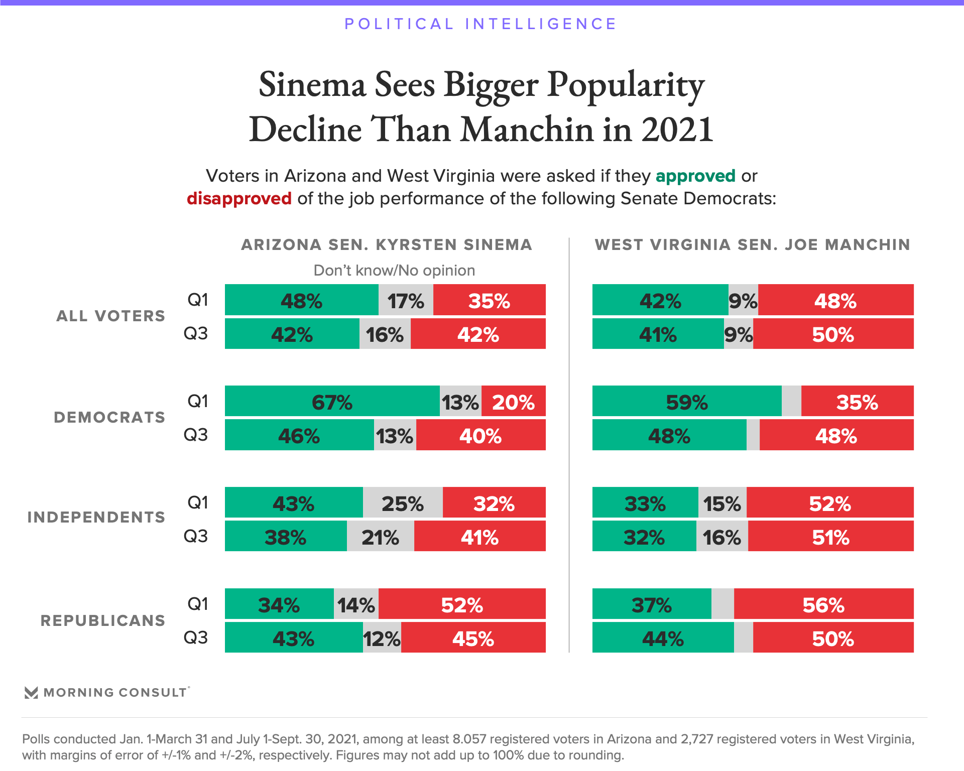 According to Morning Consult Political Intelligence tracking, Sinema’s approval rating fell from 48 percent to 42 percent among registered voters in Arizona between the first and third quarters of 2021, while the share who disapprove increased from 35 percent to 42 percent during that time.