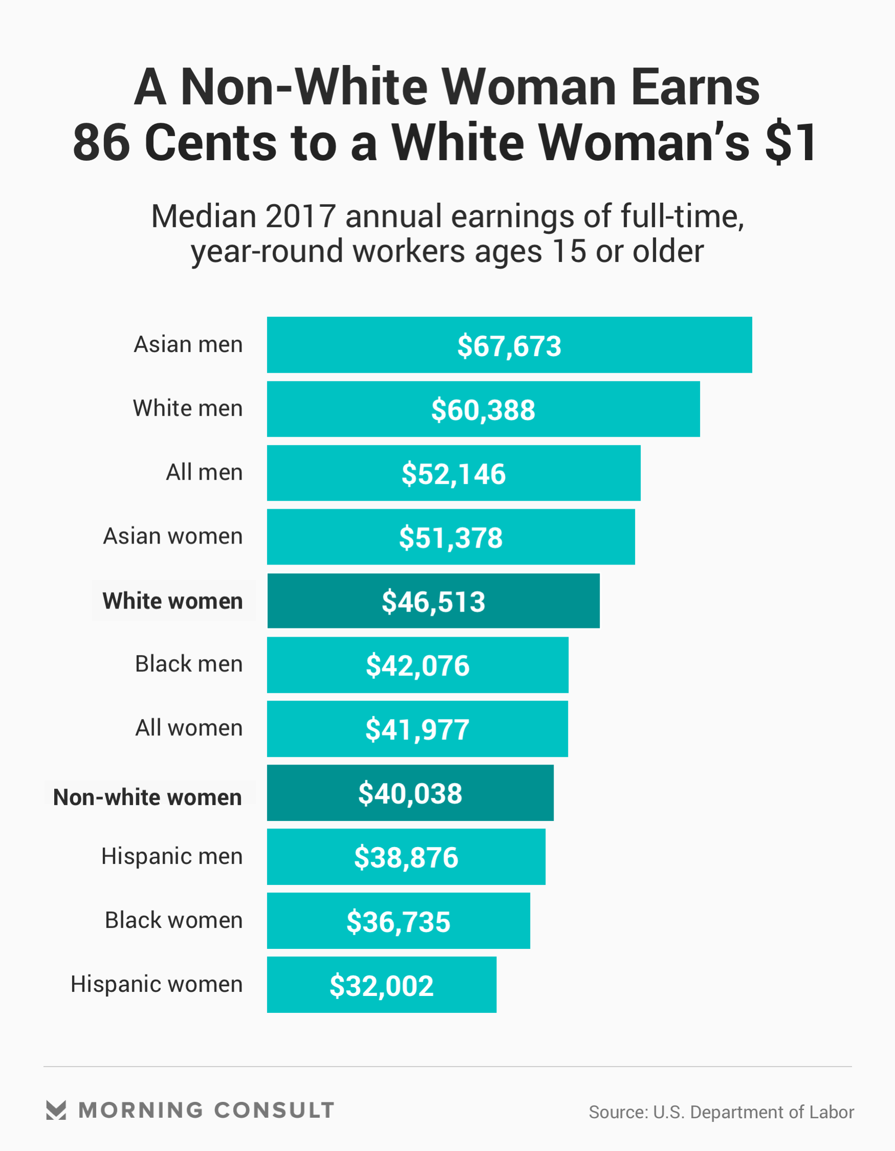 The average of the median earnings of black, Asian and Hispanic women was $40,038 that same year, 76 percent of men’s median salary and 86 percent of white women’s median salary ($46,513).