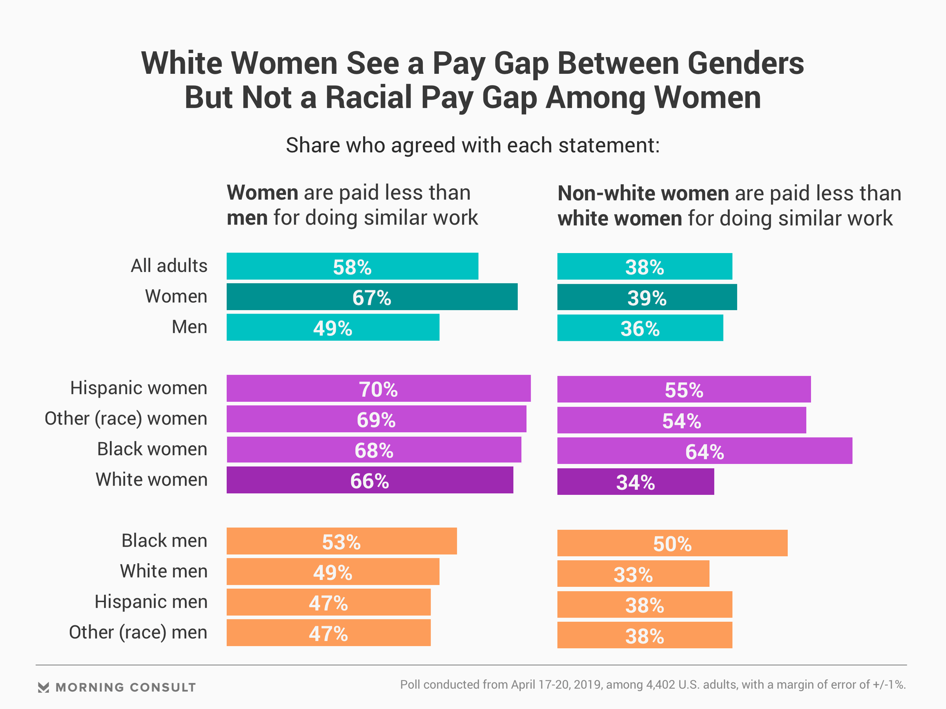 Sixty-seven percent of women, including 66 percent of white women, in the April 17-20 Morning Consult/ASCEND poll agreed that women are paid less than men for doing similar work. That view is backed up by a March study from Glassdoor Economic Research that found women earned 95.1 cents for every dollar earned by men with the same job title, employer and location.