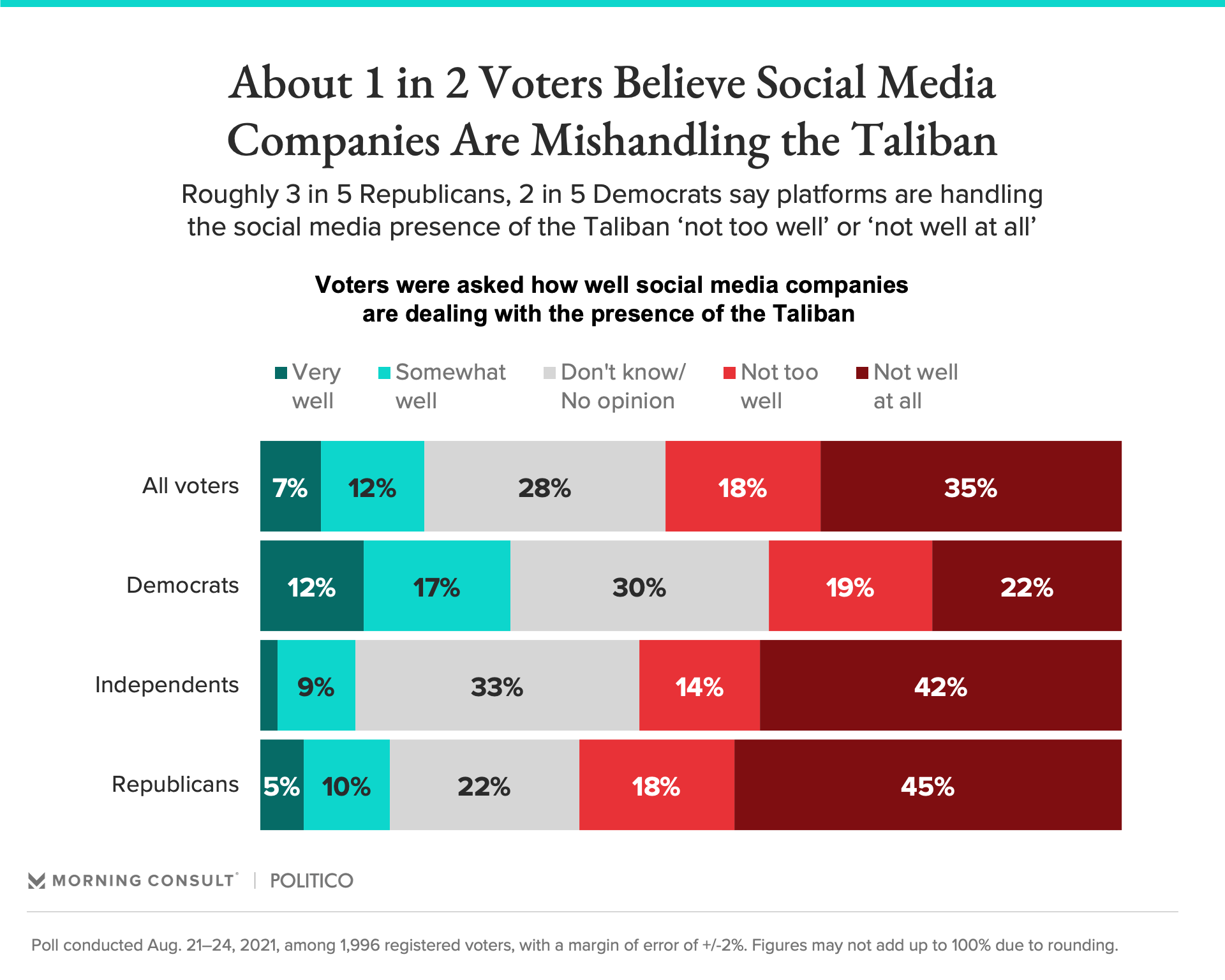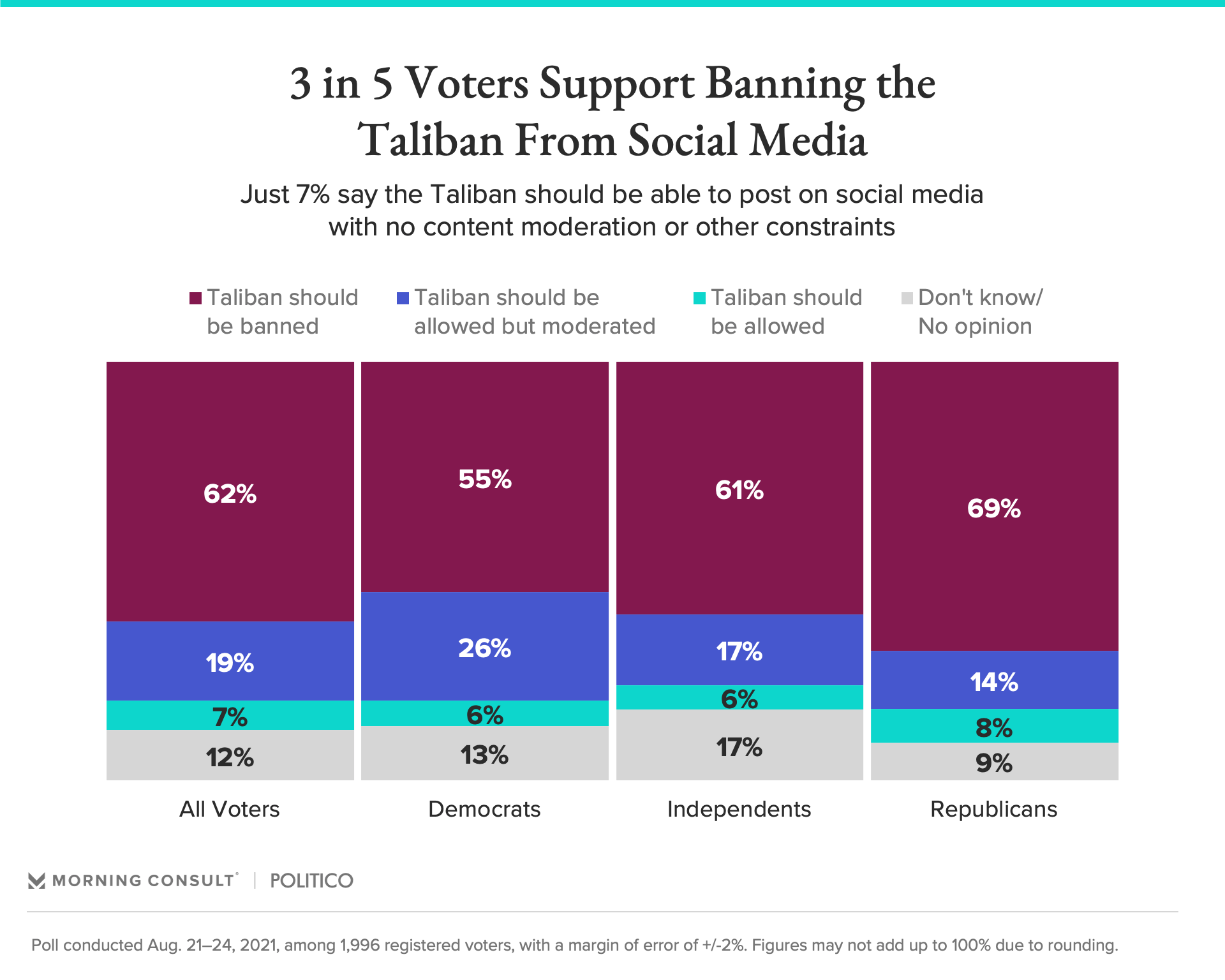 As the Taliban looks to increase its presence on social media sites following its sudden takeover of Afghanistan, companies are split so far on whether to ban the group from their platforms. But a new Morning Consult/Politico poll shows that most voters are in favor of blocking the group from using social media.
