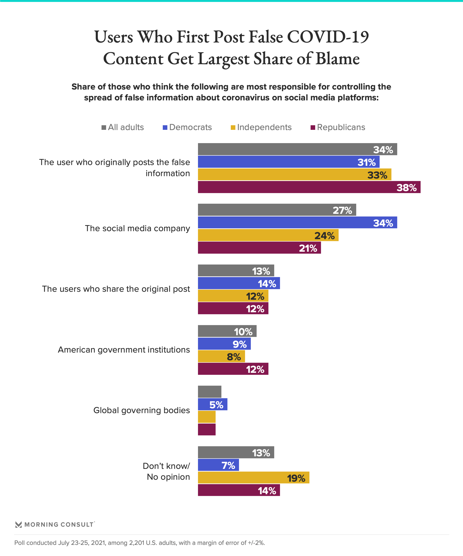 Sixty-three percent of adults said they’d support a federal bill holding internet platforms responsible if content generated by their users and other third parties spread misinformation about COVID-19 vaccines and public health emergencies, including 78 percent of Democrats, 57 percent of independents and 52 percent of Republicans.