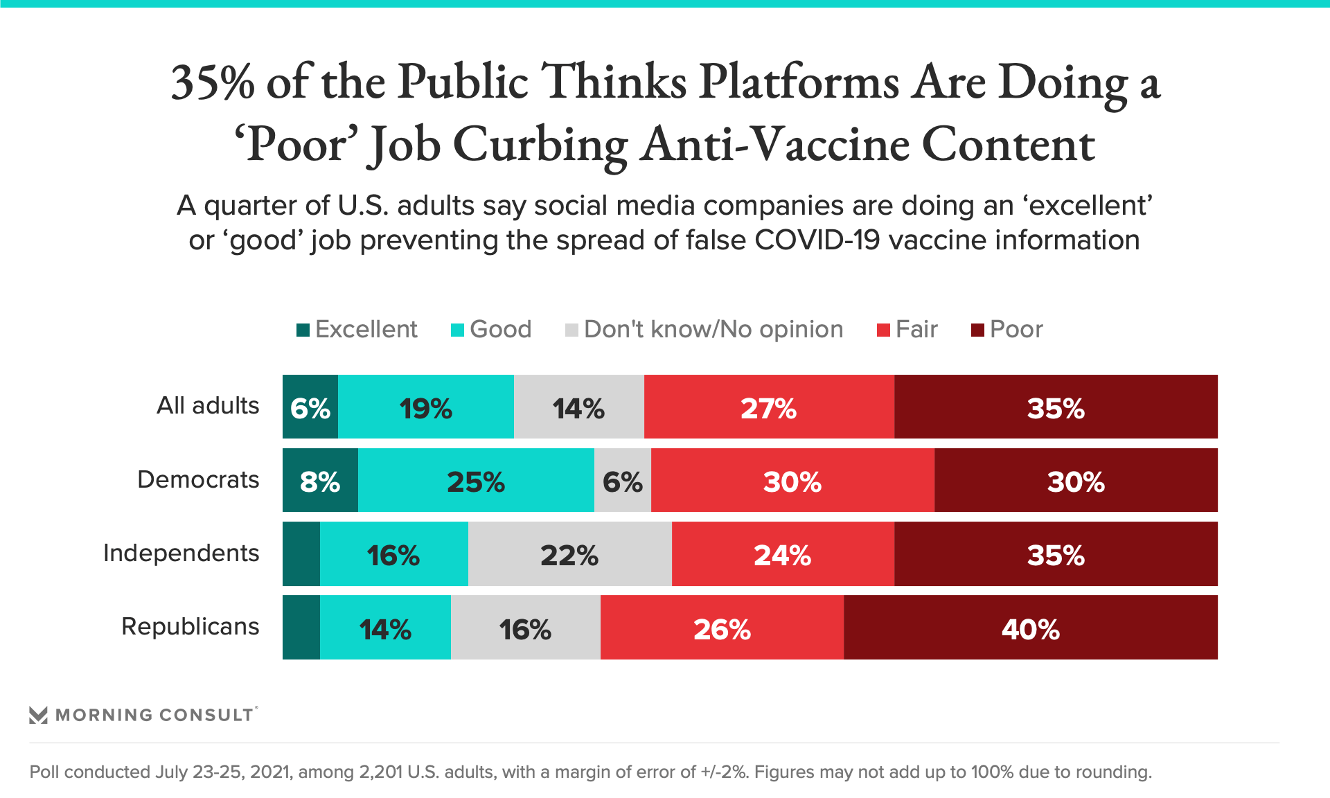 35% of adults say social media companies are doing a “poor” job of curbing the spread of anti-vaccine misinformation, while another 27% say their performance is “fair.”