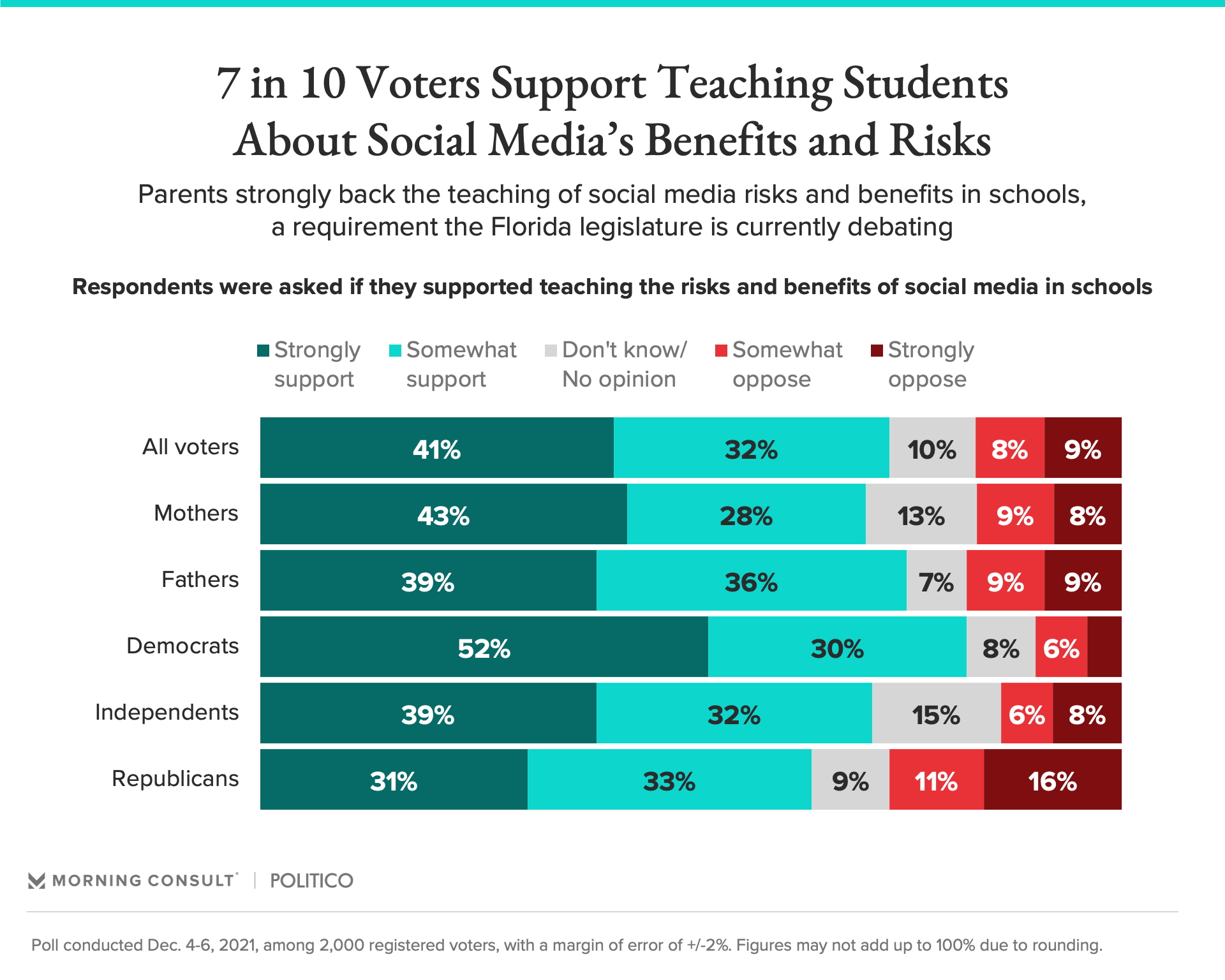 More than 70 percent of voters said they support teaching students about the benefits and risks of social media in schools, according to a new Morning Consult/Politico poll, which comes after the Florida Senate advanced a bill that would require such a practice in the state’s public schools.