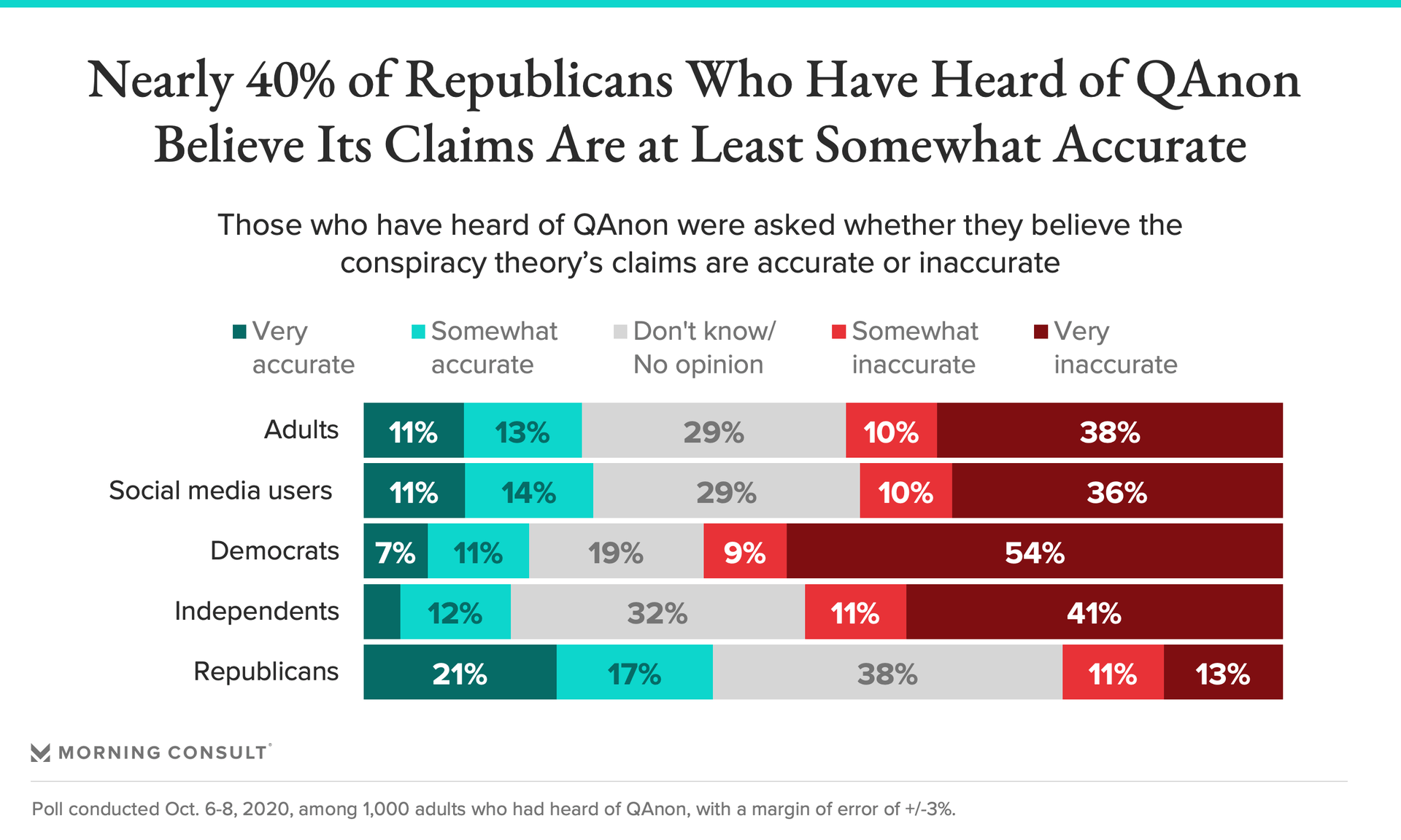 Republicans, in particular, have been drawn to QAnon, with 38 percent of GOP adults who had heard of QAnon saying they believed the claims were at least somewhat accurate, compared to 18 percent of Democrats and 16 percent of independents.
