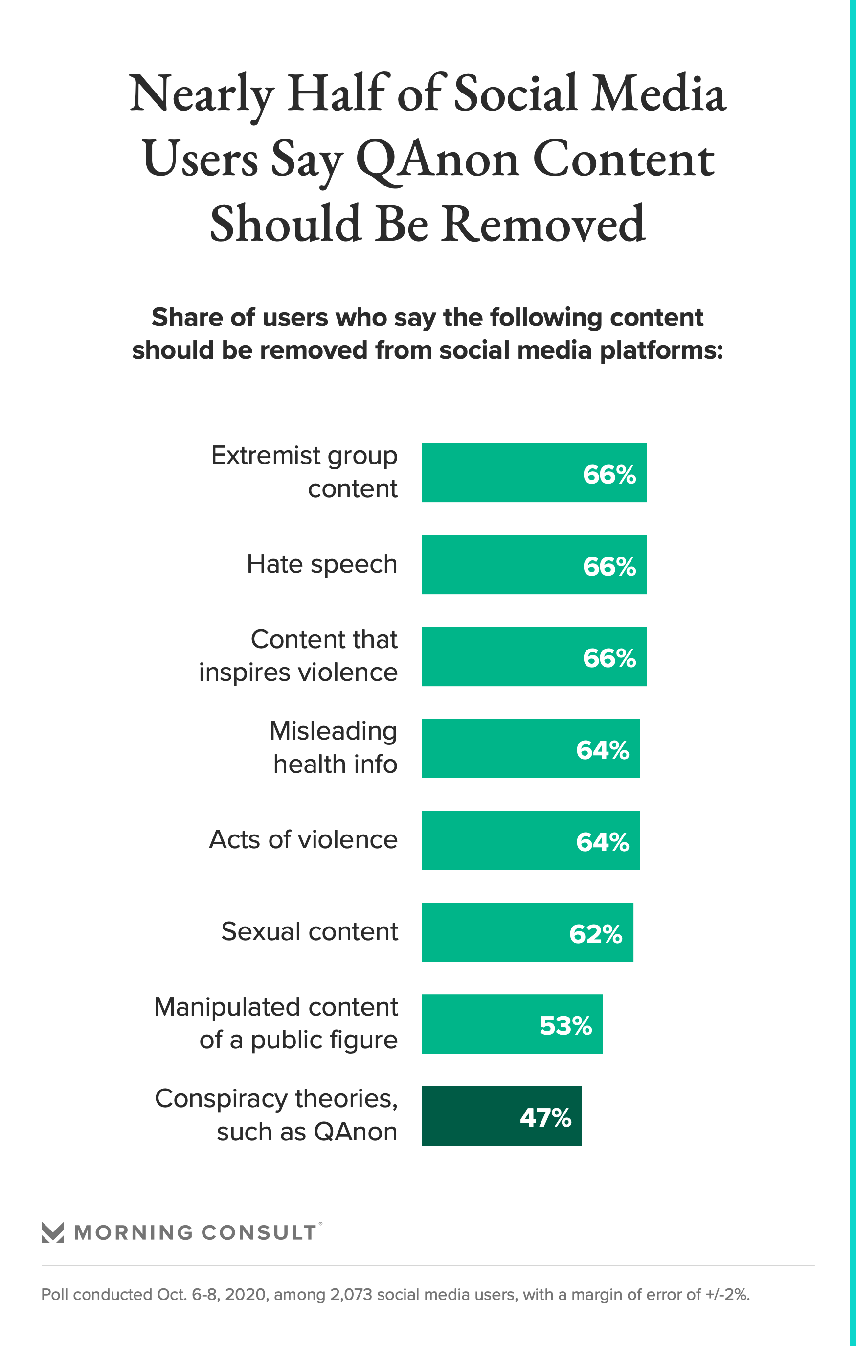 And 47 percent of social media users said that conspiracy theory content, including QAnon ideas, should be removed from the platforms -- the lowest share for any other type of content listed in the question. Thirteen percent said the content shouldn’t be removed or receive a warning, the highest share of any other content type tested.