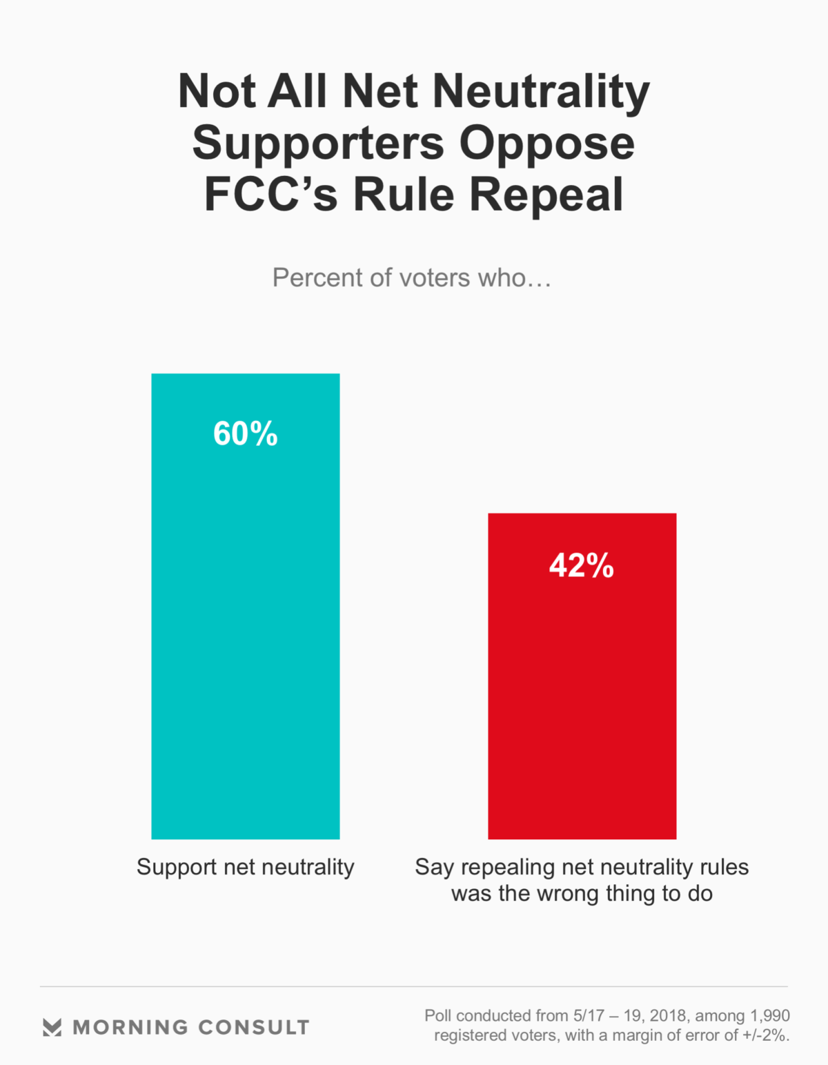 Sixty percent of registered voters in a May 17-19 Morning Consult/Politico poll said they support net neutrality rules, while responses to a separate question found that 42 percent said repealing net neutrality was the wrong thing to do. The figures represent an 18 point gap between voters who support the rules and those who oppose their repeal.