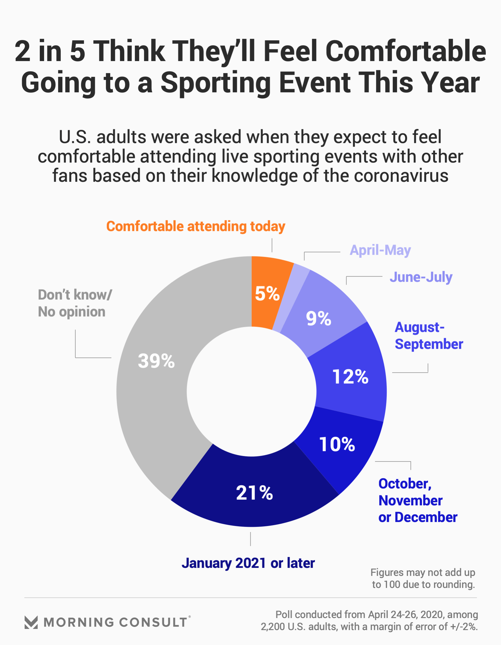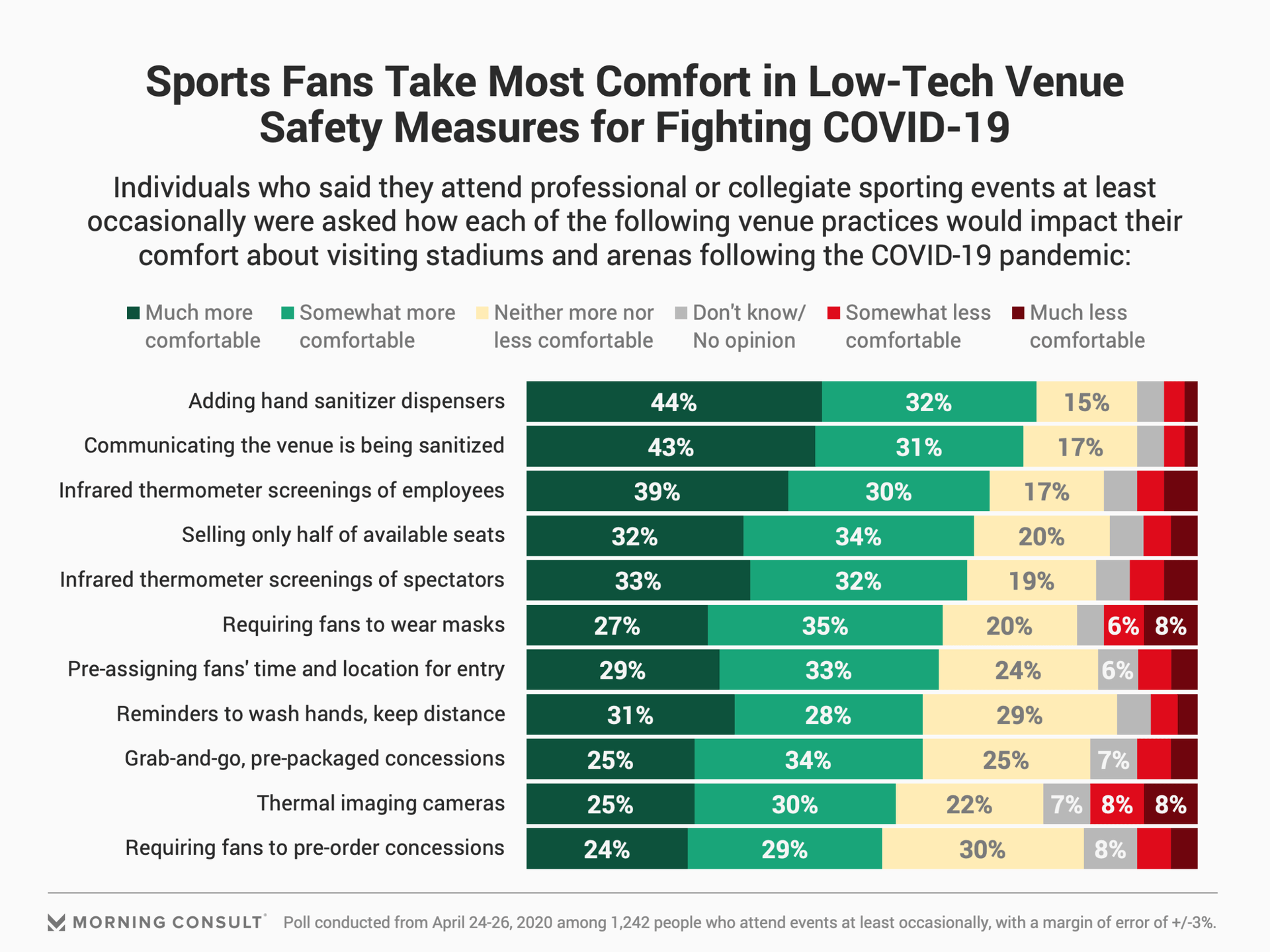 Over the past six weeks, Hall and her colleagues in the sports safety space have started exploring a wide range of potential measures to combat the spread of the coronavirus in venues and provide fans with peace of mind upon their return. A recent Morning Consult poll shows that less than 40 percent of U.S. adults anticipate feeling comfortable attending a sporting event sometime this year.