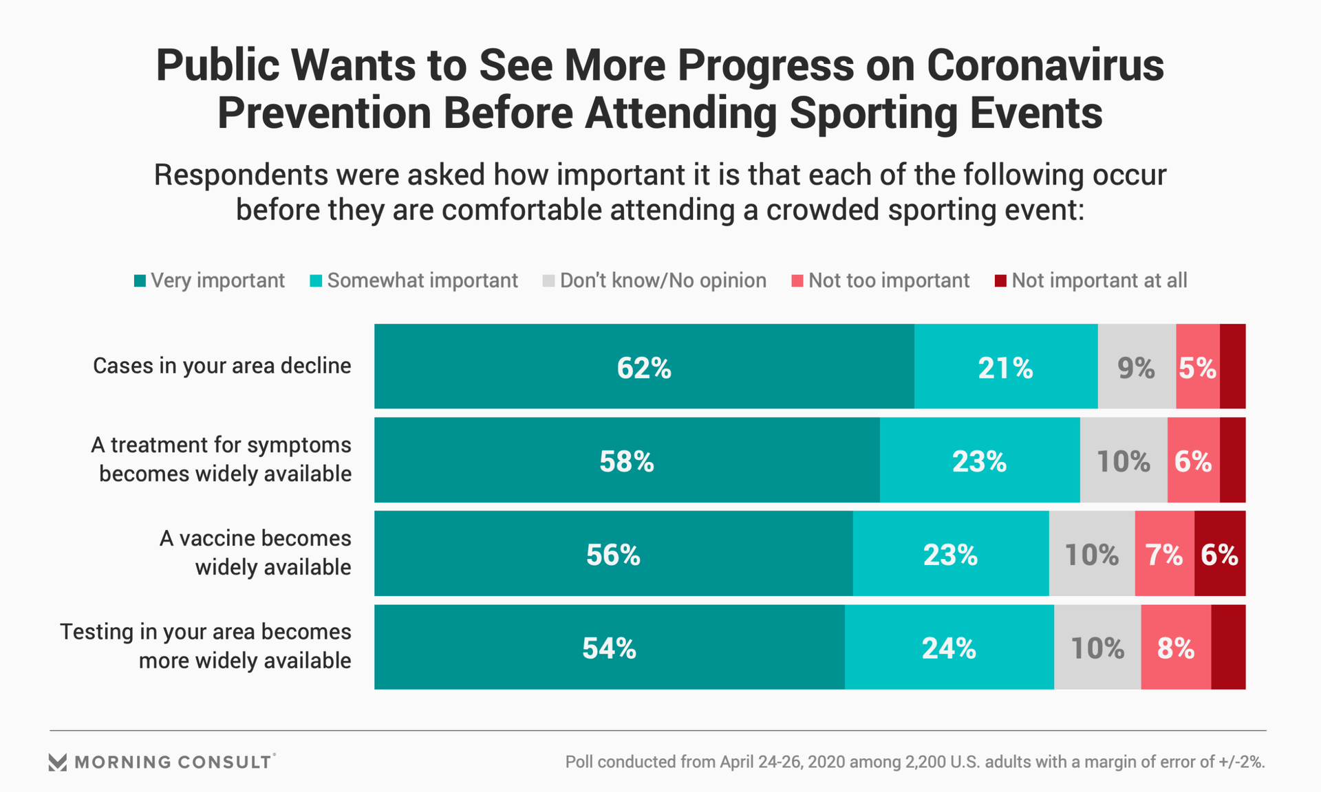 Roughly 4 in 5 respondents said it is critical that testing for the disease or treatment of its symptoms become widely available before they attend sporting events, and 79 percent said it’s important that a vaccine is developed and made available before they are comfortable going.