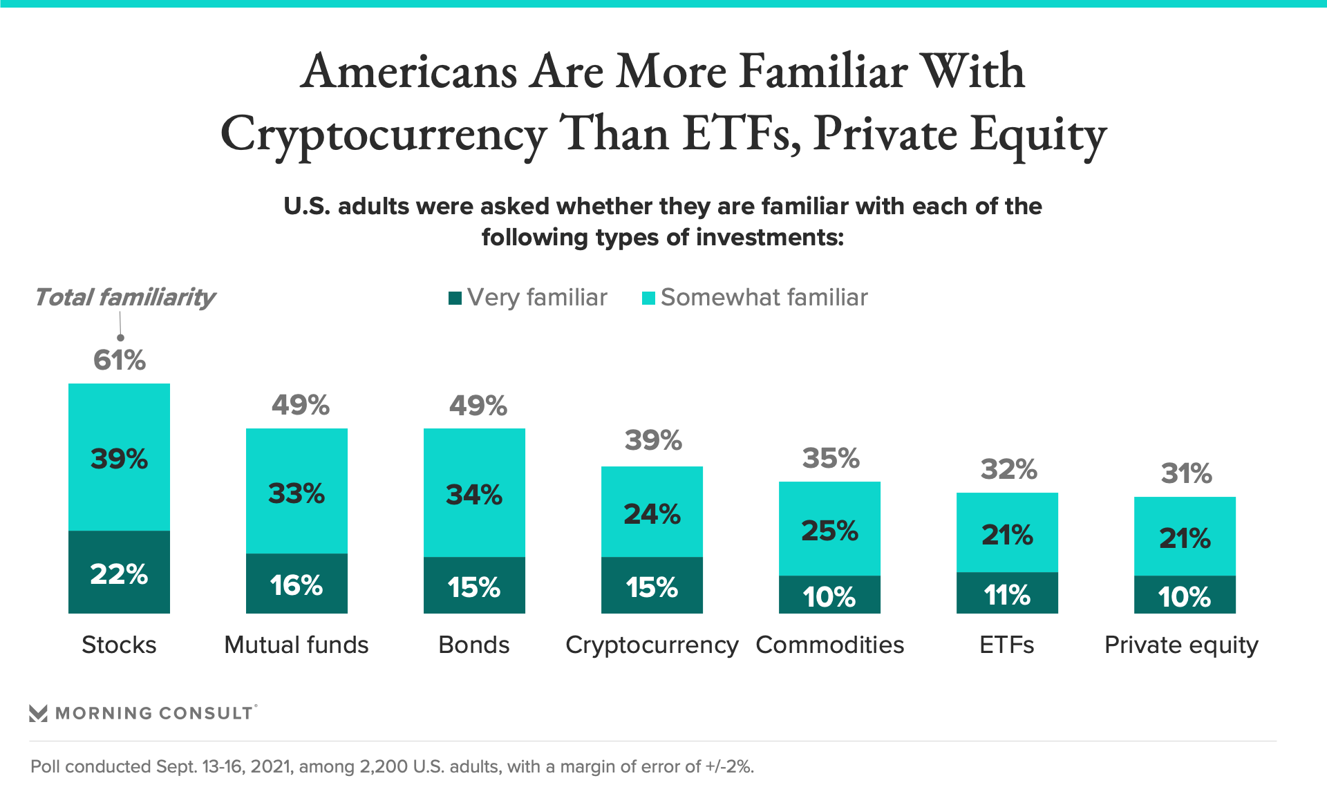 Still, familiarity with cryptocurrency among the American public trails that of more traditional investment vehicles. Sixty-one percent of U.S. adults said they’re familiar with stocks, compared to the 39 percent who said they’re familiar with cryptocurrencies. Meanwhile, 49 percent said they’re familiar with both mutual funds and bonds.