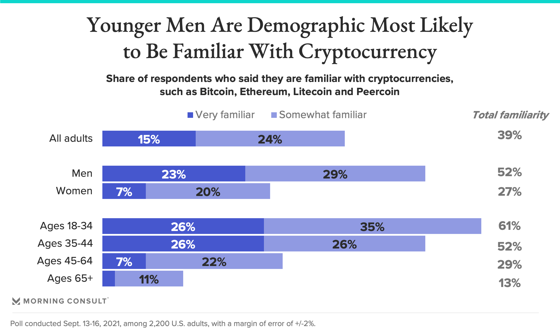 Men are about twice as familiar with cryptocurrency as women, and 3 times as likely to own some.