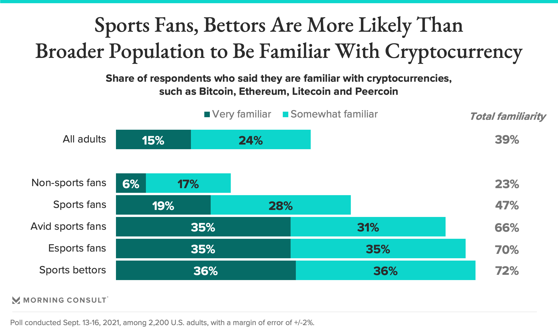 66% of self-proclaimed “avid” sports fans and 72% of sports bettors said they’re familiar with cryptocurrency.