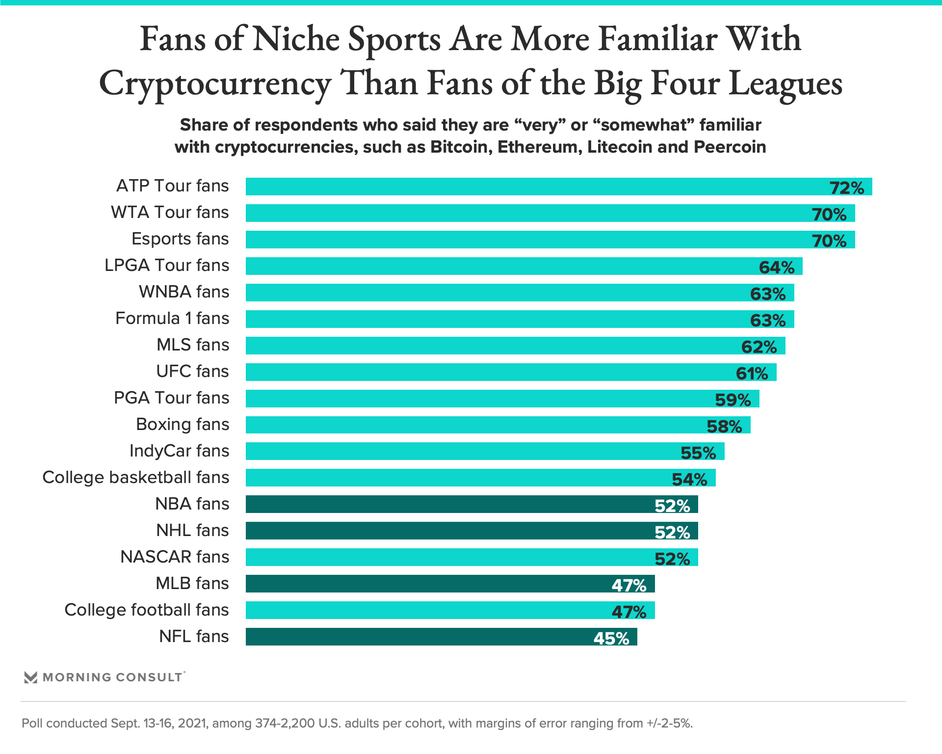 The Sept. 13-16 survey also found that fans of niche sports, such as golf, tennis and the WNBA, were more likely to say they are familiar with cryptocurrency and to hold cryptocurrency than fans of the “Big Four" leagues. For example, 72 percent of self-identified fans of the ATP Tour said they are familiar with cryptocurrency, compared with 47 percent of MLB fans and 45 percent of NFL fans.