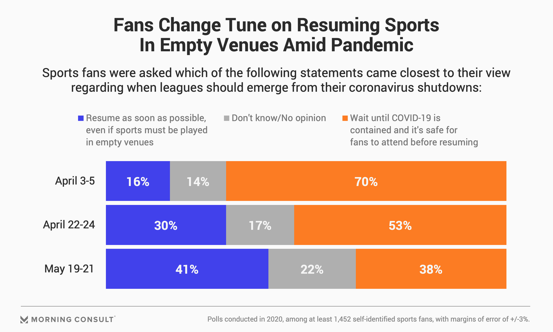 The results of a May 19-21 Morning Consult poll show that 41 percent of self-identified sports fans favor a timely return to play, compared with 38 percent who prefer waiting until it’s safe to host crowds on site.