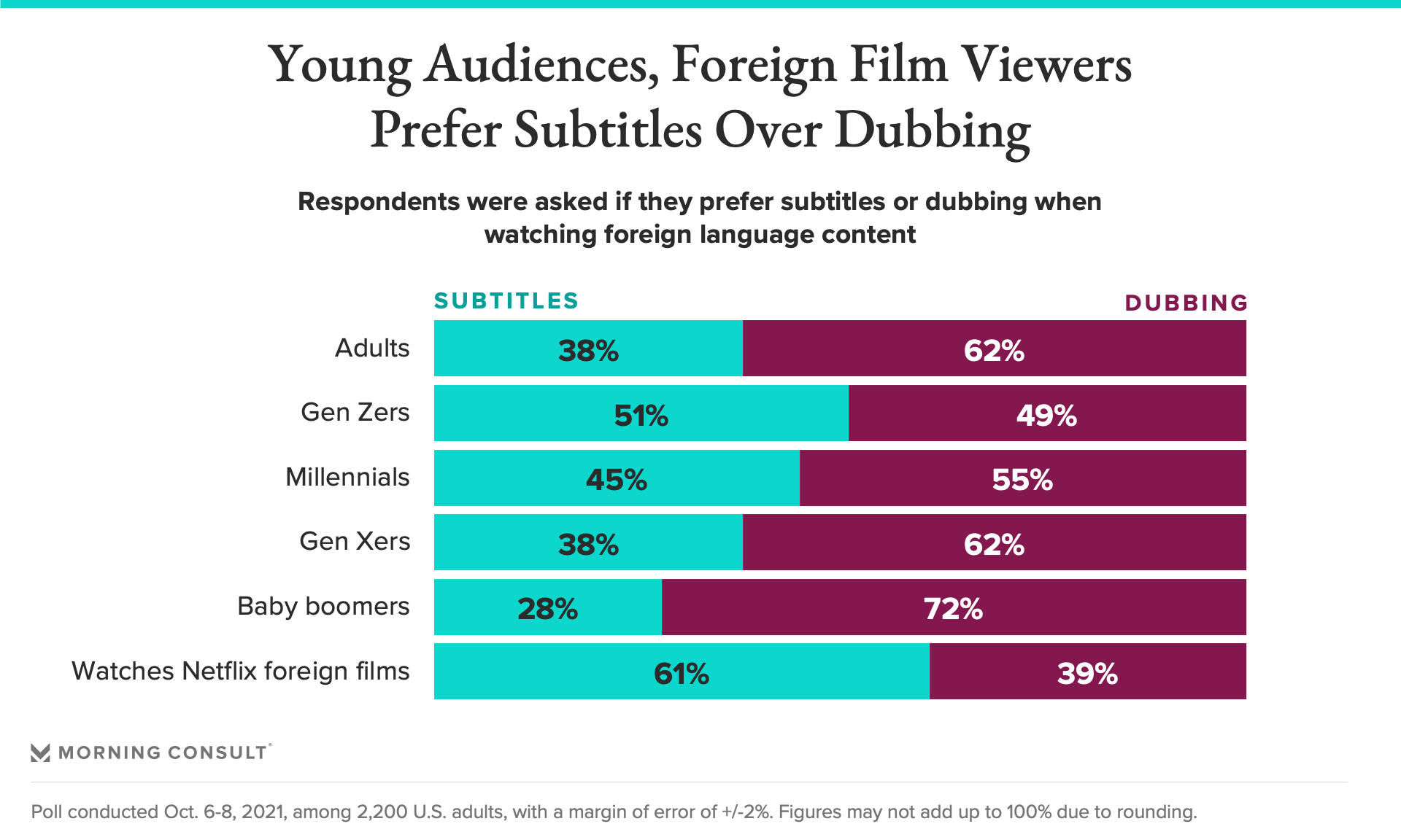 - The majority of adults (62 percent) prefer to watch foreign-language content with dubbing instead of subtitles. That showed little movement from a 2020 survey tied to the Oscar campaign for the Korean film “Parasite.”