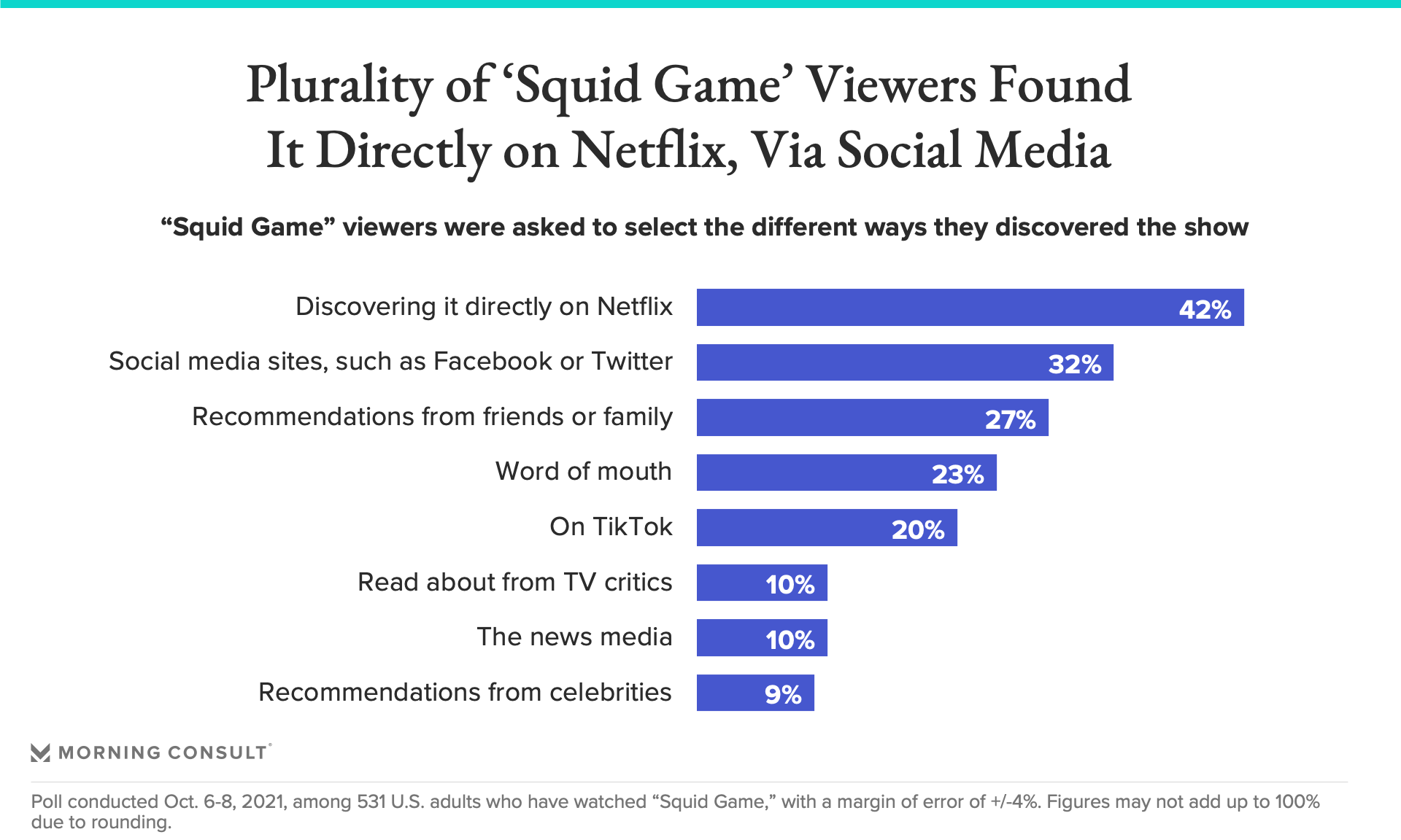 - Forty-two percent of “Squid Game” viewers said they found the show directly on Netflix, underscoring the power of the service’s homepage to reel in viewers. The company does not do much traditional advertising of its original content.