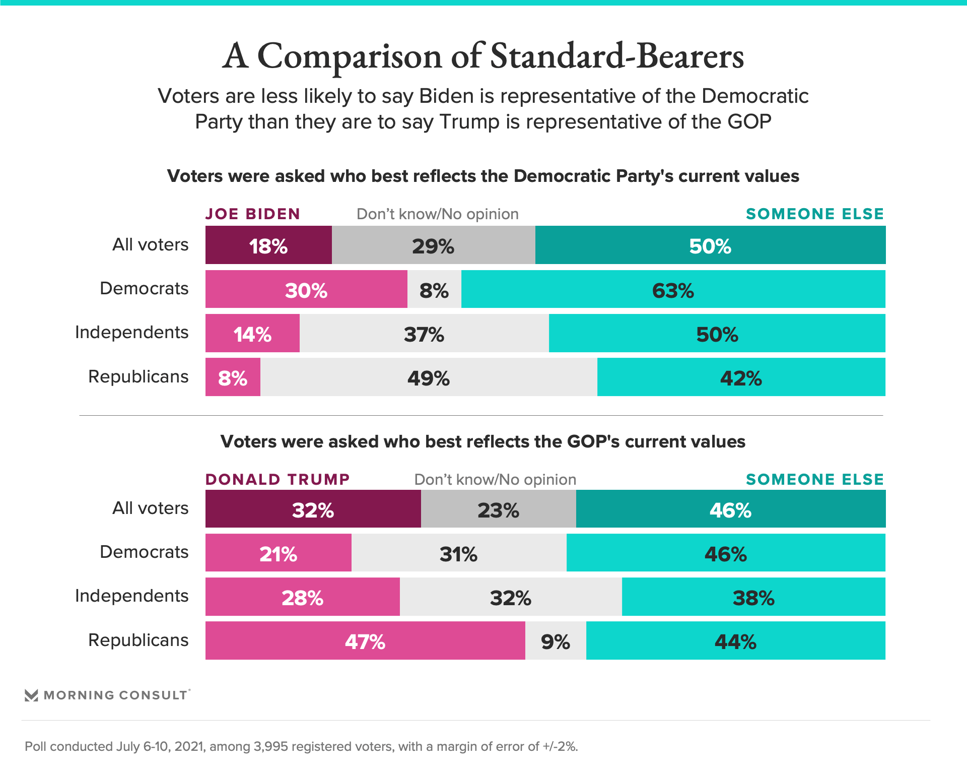The findings show Biden to be less synonymous with the Democratic Party among the overall electorate than former President Donald Trump is with the GOP: 32 percent of all voters, including nearly half of Republicans, said Trump best represents the Republican Party’s current values, while 46 percent picked someone else.