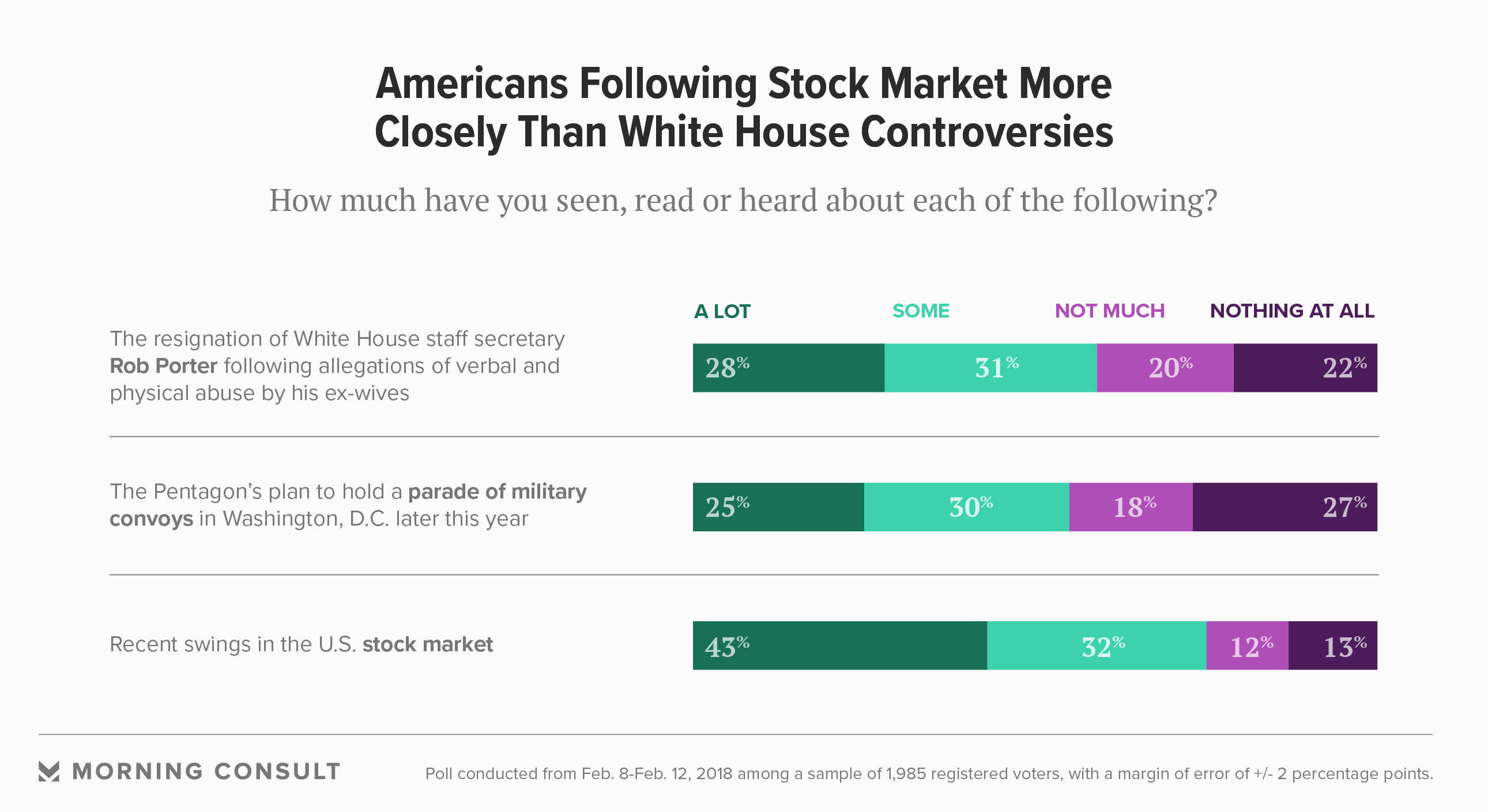 A Morning Consult/Politico survey conducted Feb. 8-12 found that 43 percent of registered voters said they had seen, heard or read a lot about this month’s market sell-off, which included the largest single-day point loss for the Dow Jones Industrial Average and the Standard and Poor's 500 Index notching its largest weekly percentage loss since January 2016.