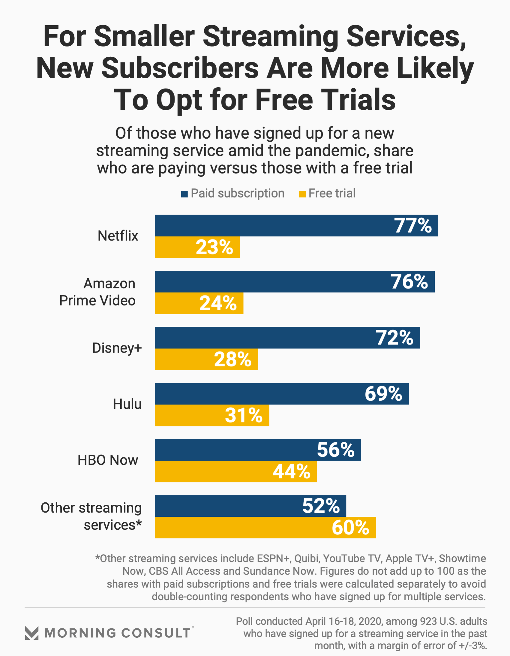 In an increasingly crowded streaming marketplace, platforms such as Quibi, Apple TV+ and Disney+ are enticing stuck-at-home viewers with free trials in hopes of forming viewing habits that will extend beyond the pandemic. A new Morning Consult report finds that for smaller, less-established platforms, consumers are taking advantage of free trial periods, with disagreement among experts on whether this will translate to regular-paying viewers.