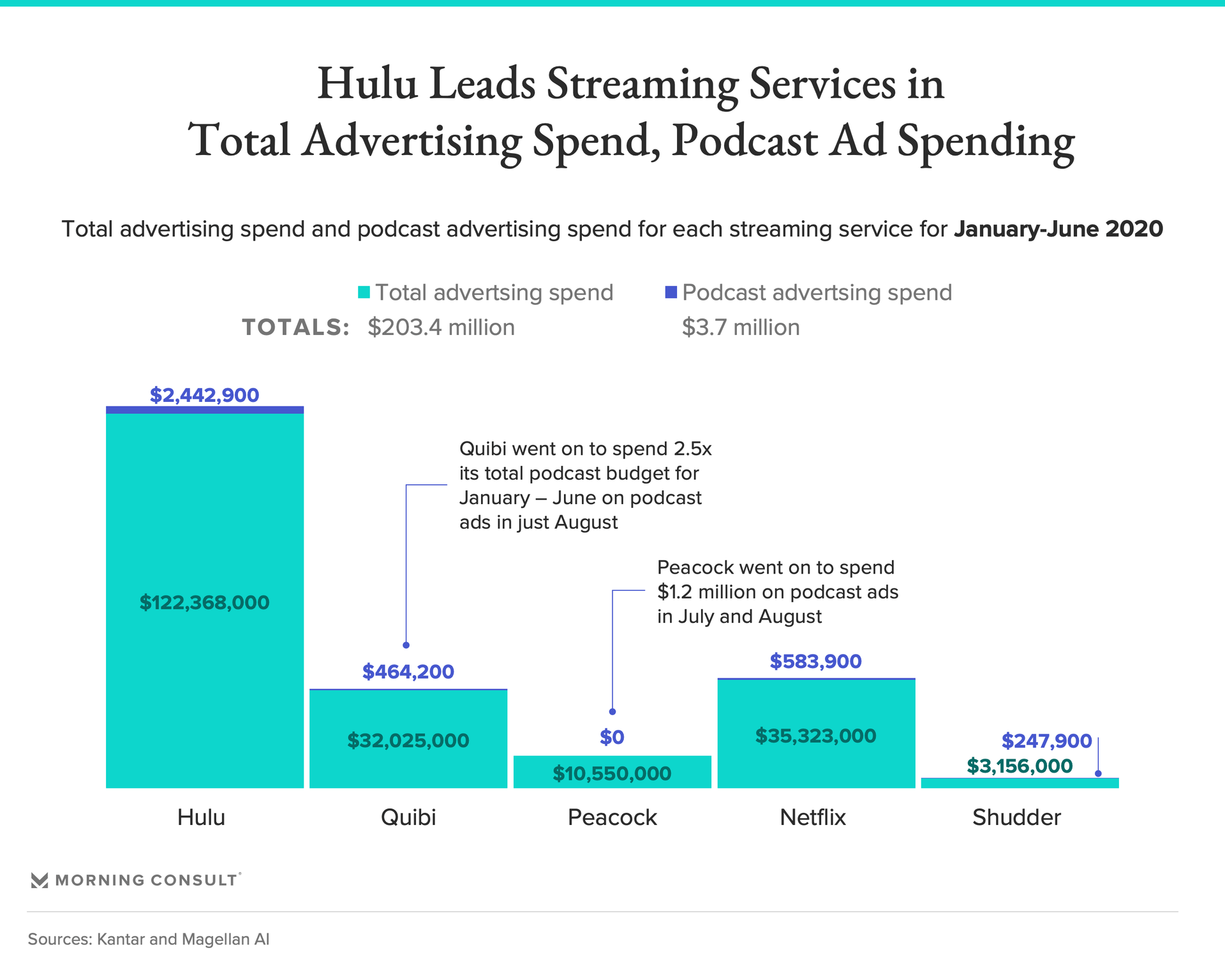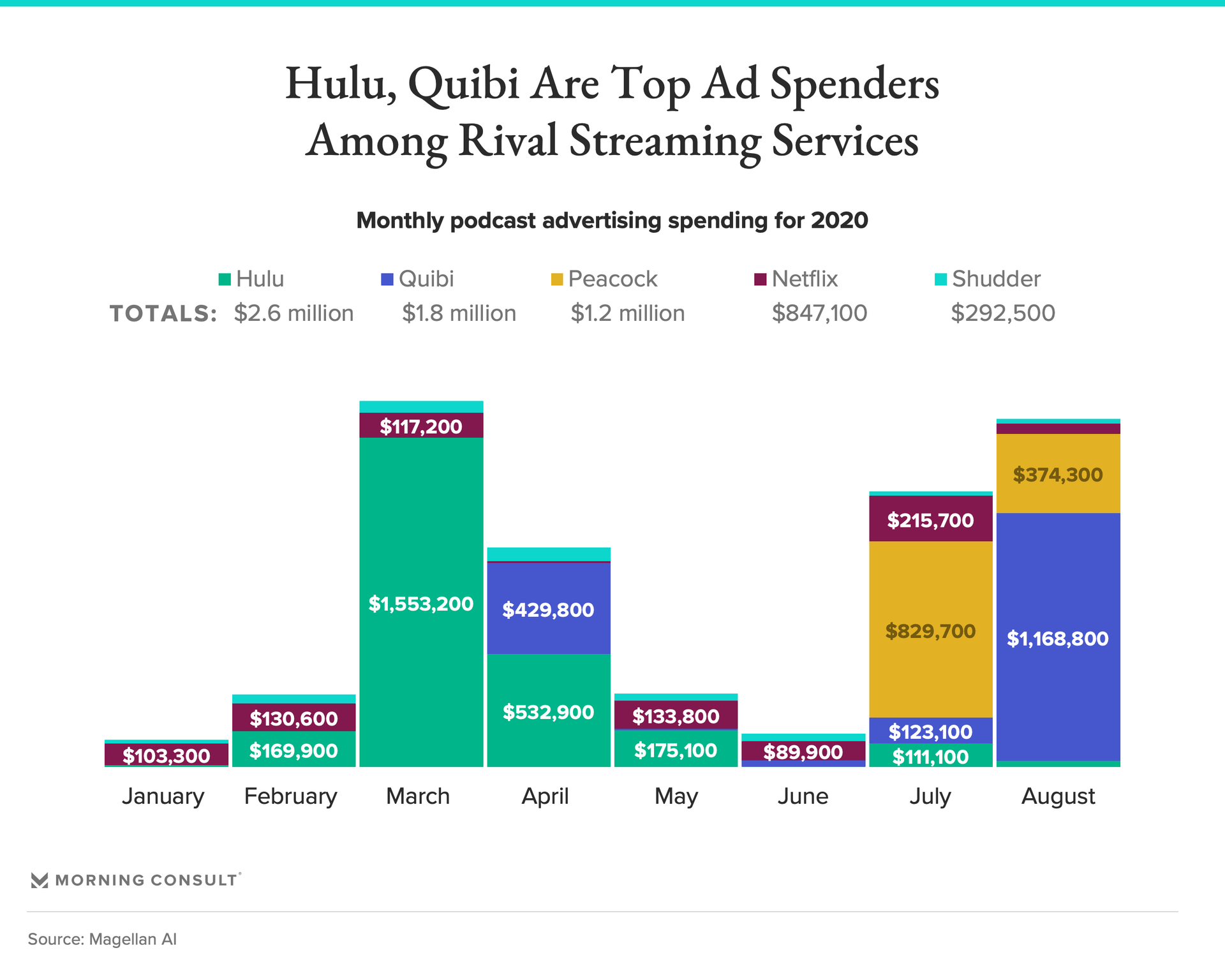 Hulu upped its podcast ad budget at the start of the COVID-19 pandemic, spending more than $1.5 million on podcast ads in March alone out of nearly $2.6 million spent on podcast ads between January and August, while Quibi and Peacock looked to podcasts to attract potential customers around the time they hit the market.