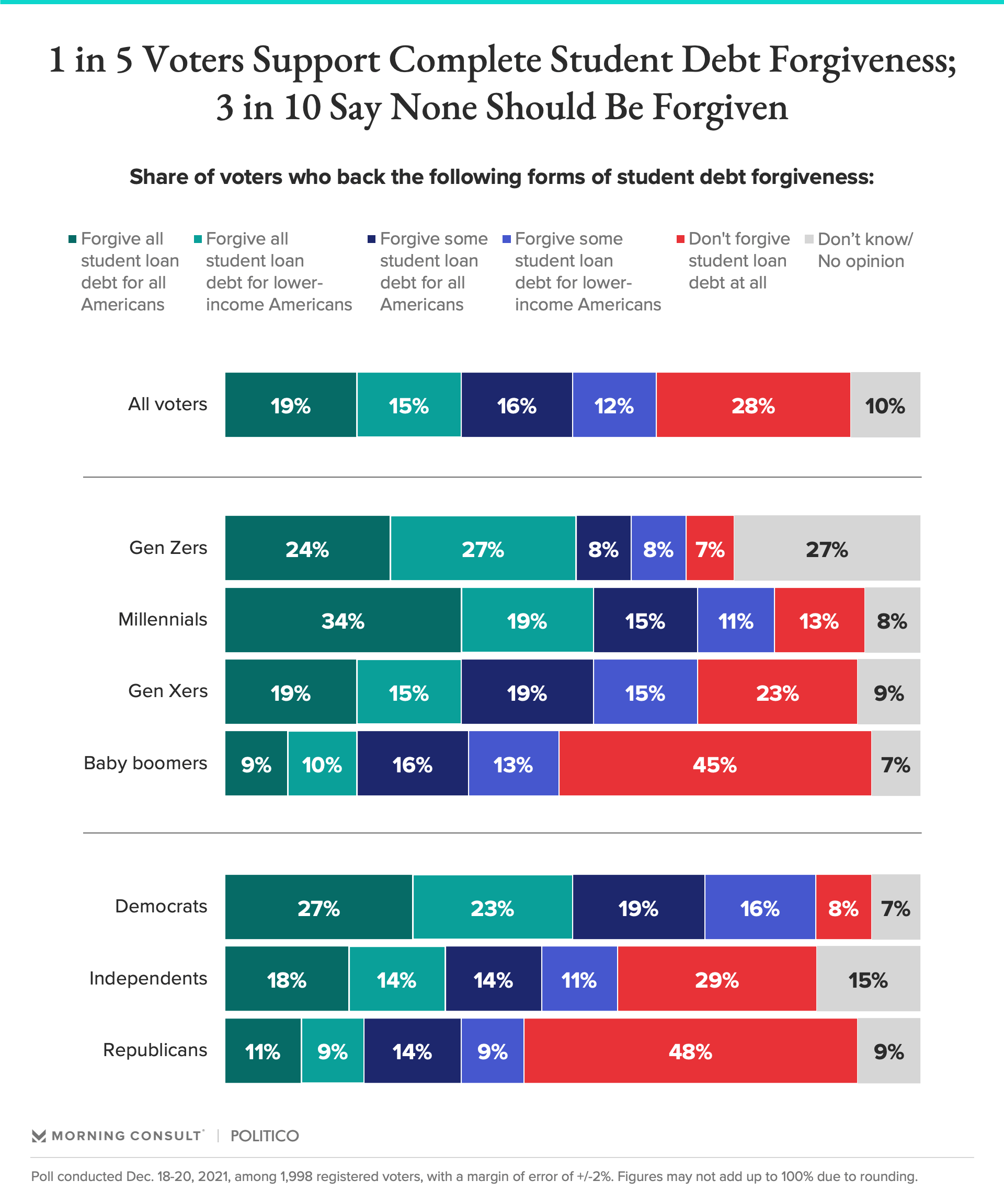 - Generationally, millennials are the most likely cohort to believe that student loans should be forgiven entirely among all Americans (34 percent).