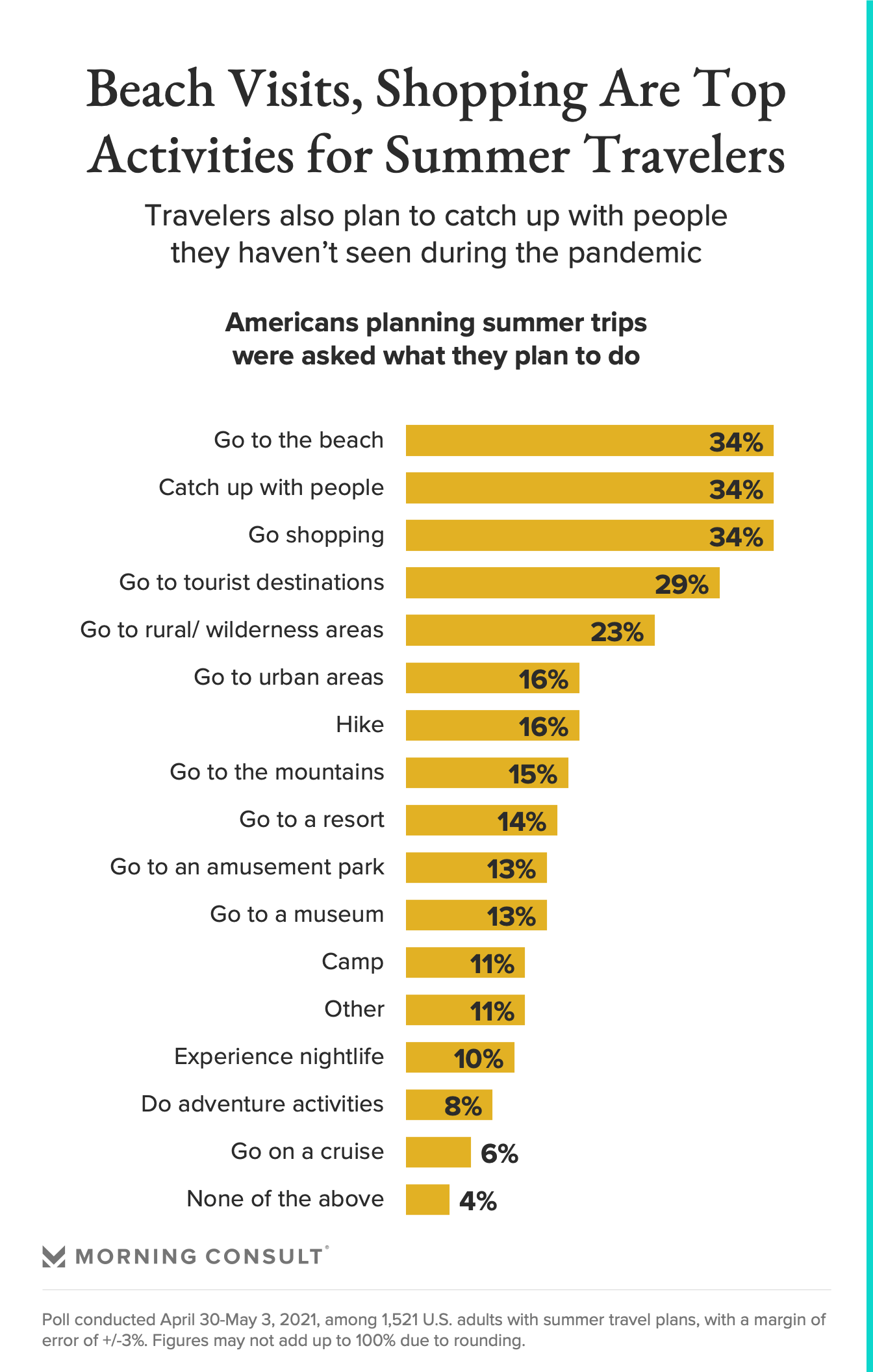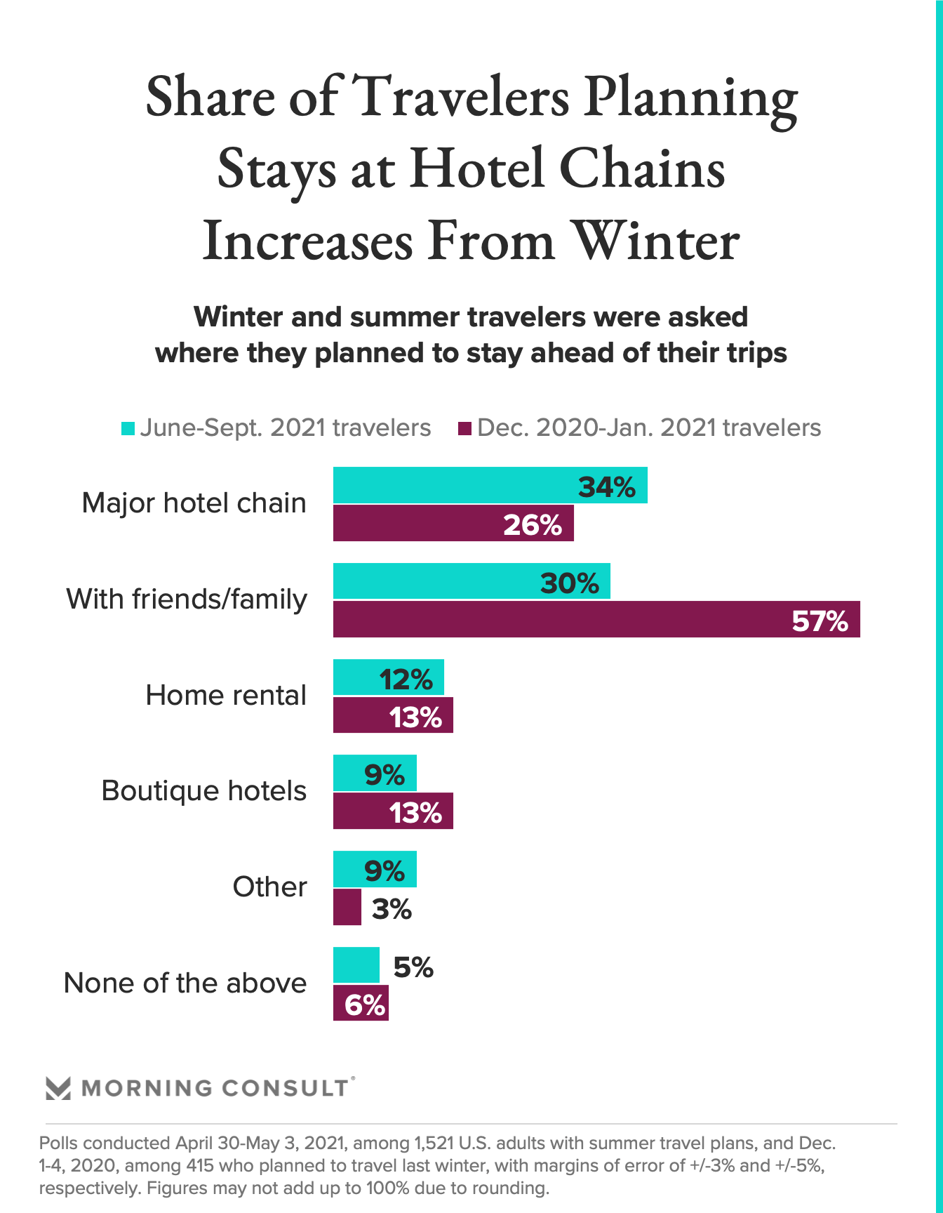 As more and more locations reopen to travel following pandemic lockdowns, many Americans are eager to act on a pent-up demand for vacations that has been building for the past year, according to new polling data from Morning Consult. But this summer, unlike in 2020, travelers don’t plan to just crash on the couches of friends and family.