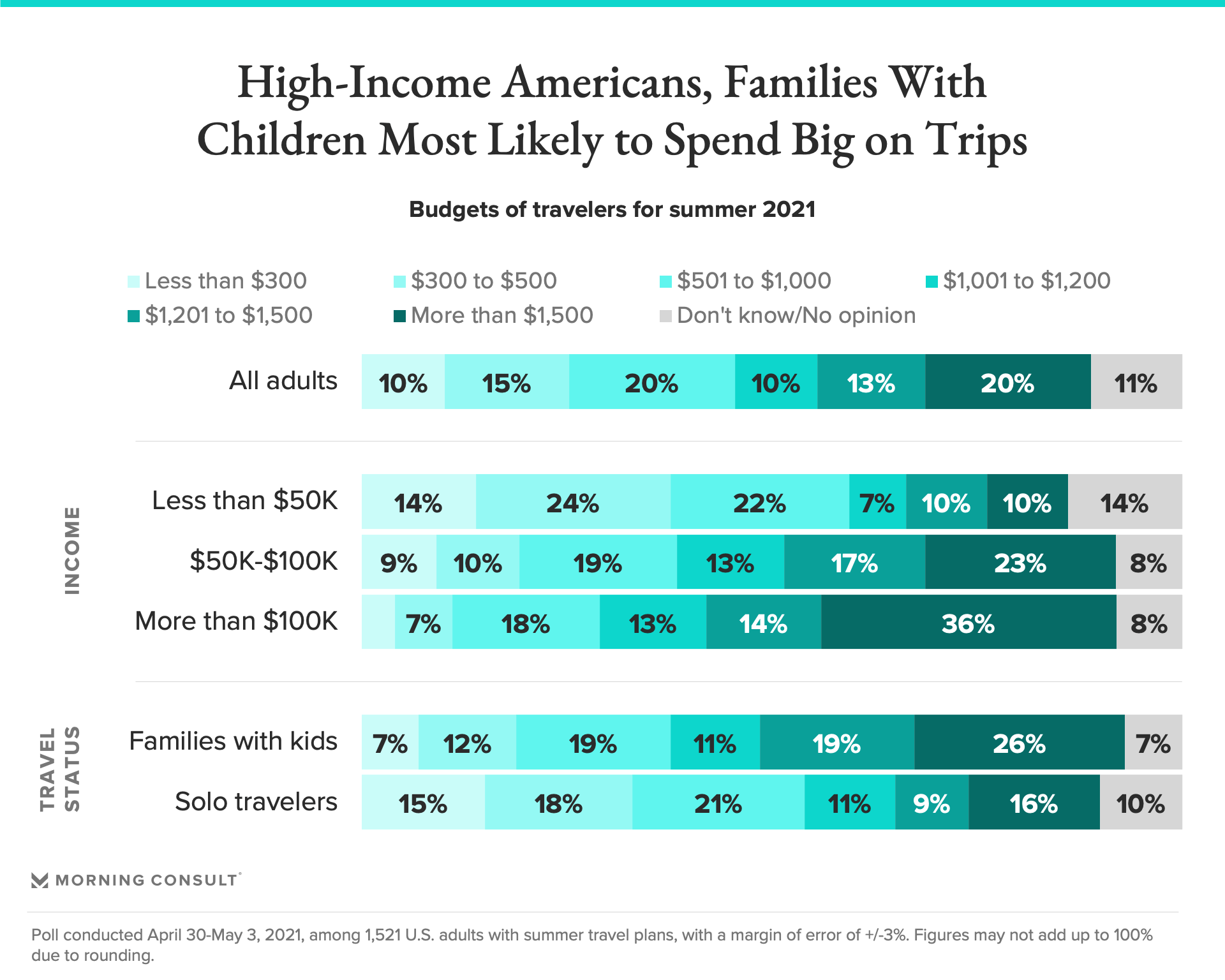 Forty-three percent of summer travelers said their budget comes in at more than $1,000, including 20 percent who said their budget exceeds $1,500, while 45 percent said they’ll spend less than $1,000. Those with higher incomes, as well as families with children, are more likely to have higher travel budgets than solo travelers do.