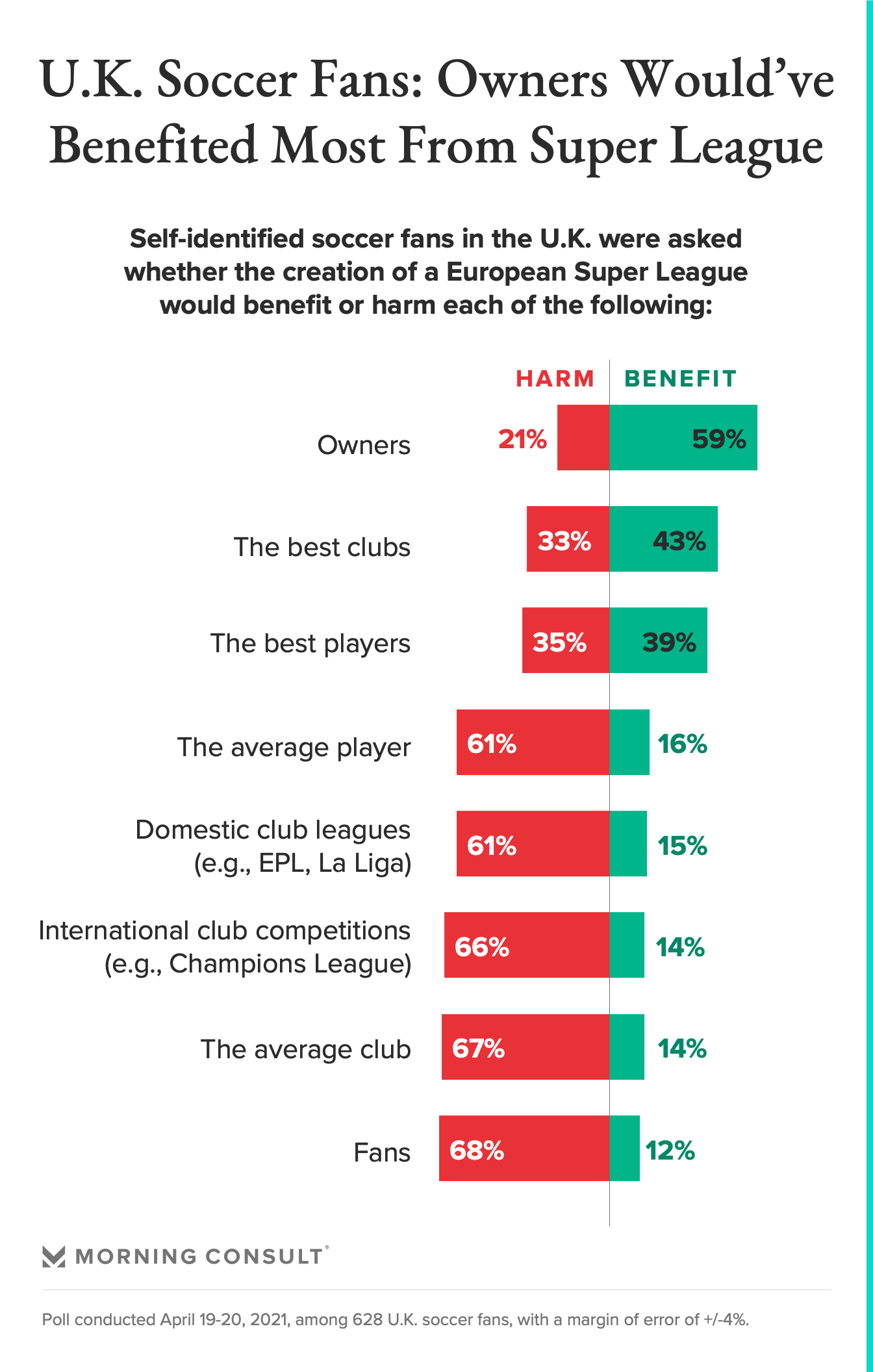 From its inception, the Super League was dogged by the sentiment that its creation was purely a cash grab by the already wealthy owners of the 12 founding clubs. Among the British soccer fans surveyed, 59 percent said the formation of the league would benefit the owners, while just 12 percent said it would benefit fans.