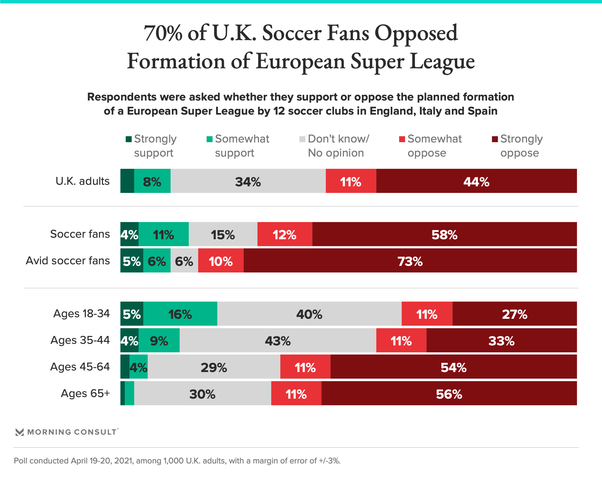 In a Morning Consult survey conducted April 19-20 ahead of the plan’s collapse, 70 percent of U.K. adults who identified as soccer fans said they opposed the move by Arsenal, Chelsea, Liverpool, Manchester City, Manchester United and Tottenham Hotspur to join six other Spanish and Italian clubs in the creation of a midweek club competition featuring the same core members each year, including 58 percent who said they “strongly” opposed the plan. In addition, 83 percent of “avid” fans of the sport opposed the Super League plan, with 73 percent “strongly” opposed.