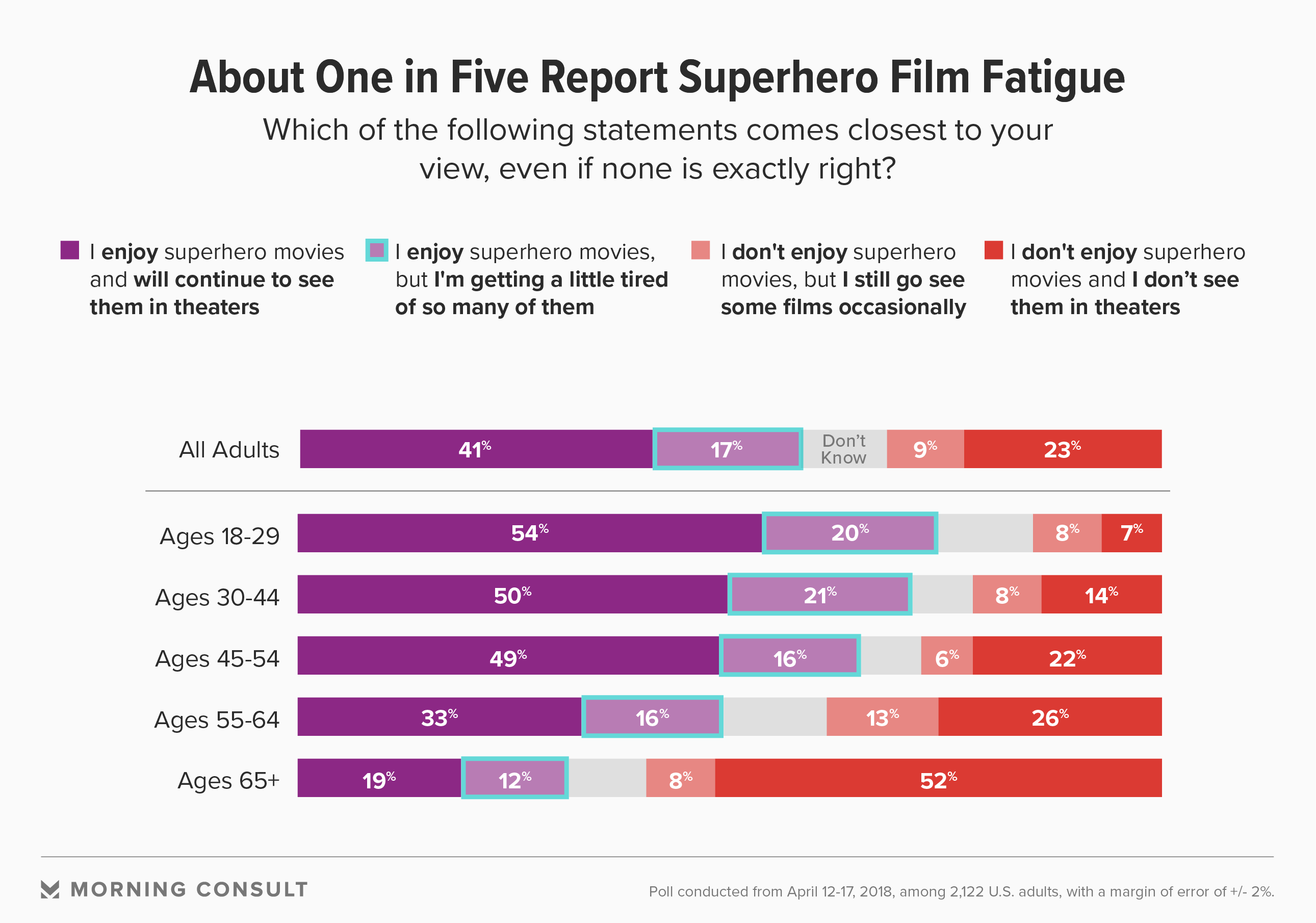 A 41 percent plurality of U.S. adults said they like superhero movies and will continue to see them. The April 12-17 poll was conducted among 2,122 U.S. adults with a margin of error of 2 percentage points.