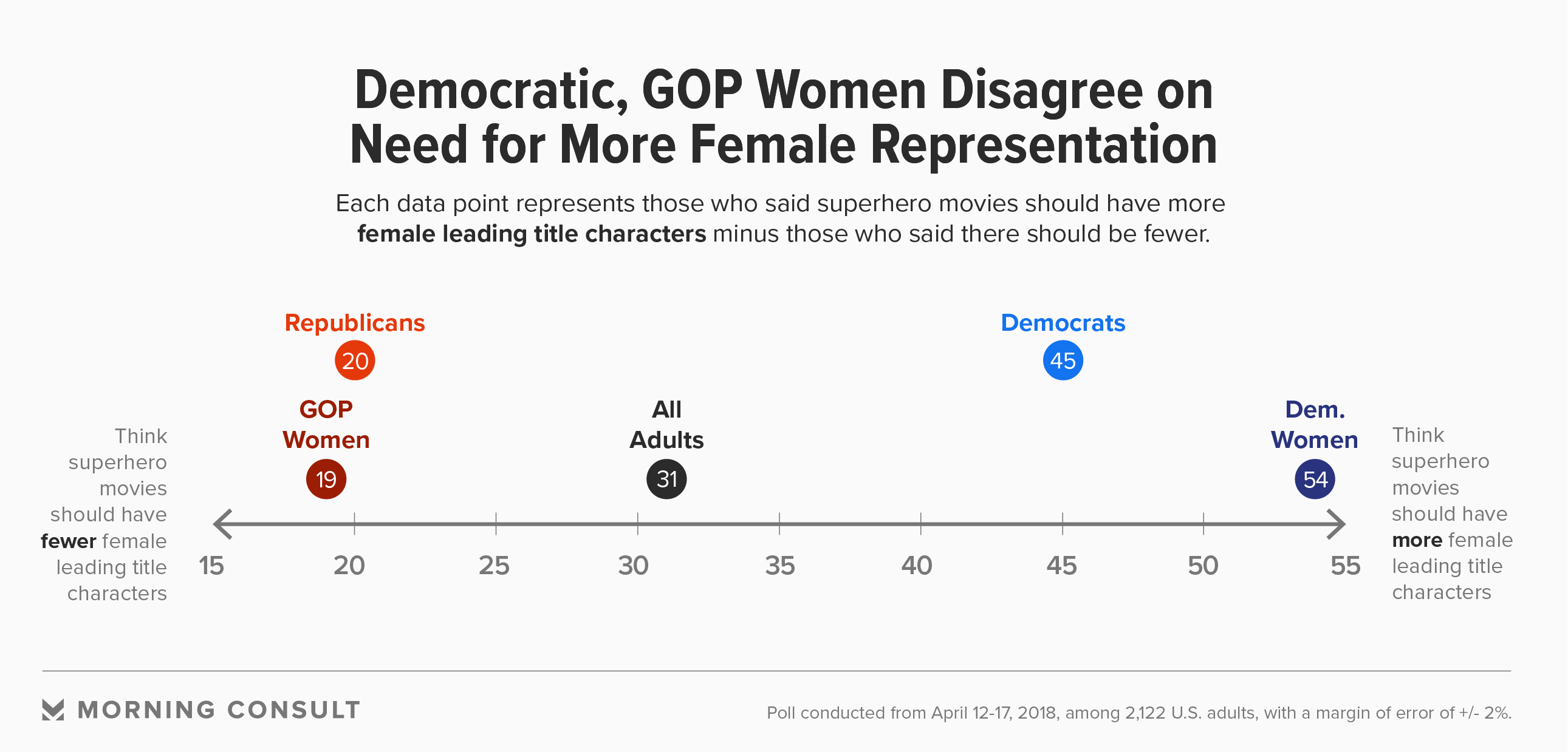 According to the Morning Consult survey, 36 percent said there should be more female title characters in superhero films, while 5 percent said there should be fewer, creating a net of 31.