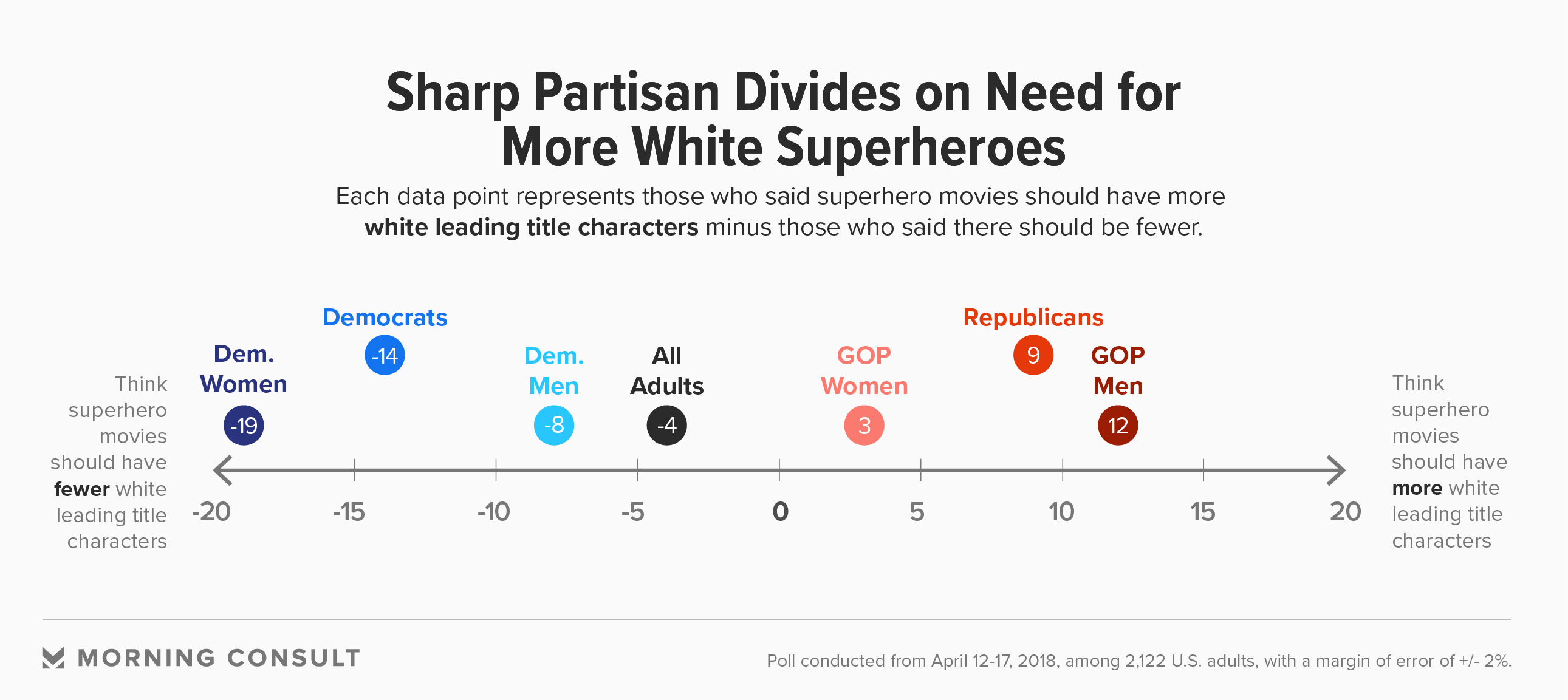 Republicans are as likely to say there should be more white superheroes (net 9) as they are to say there should be more black superheroes (net 9).
