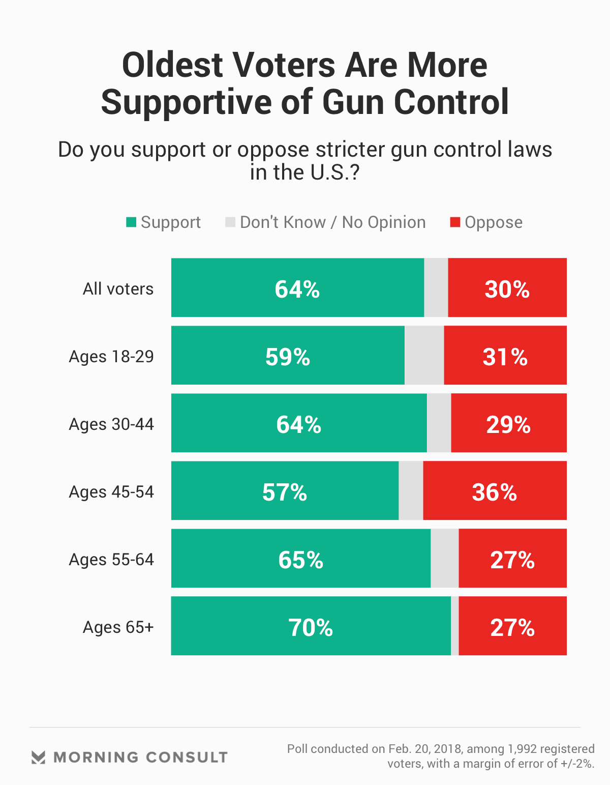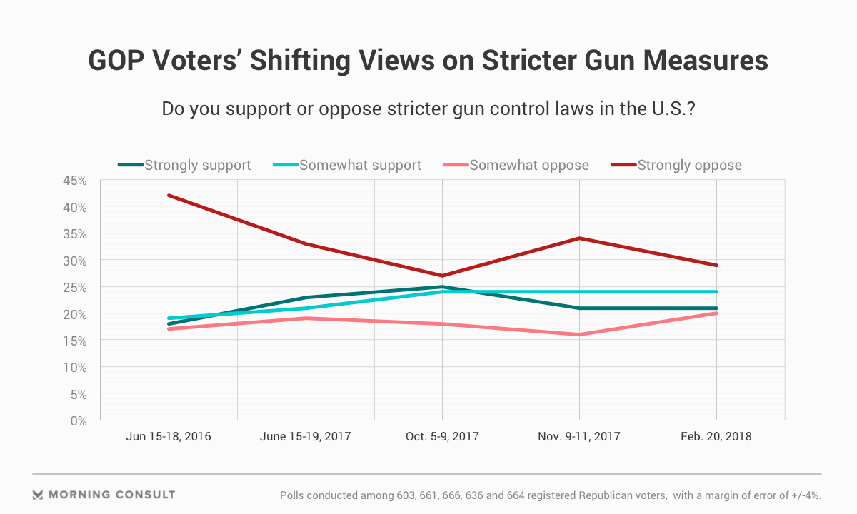 Sixty-four percent of registered voters back tougher gun control statutes, compared to 30 percent who oppose such laws, according to a Morning Consult/Politico poll on Feb. 20, almost a week after 17 people were gunned down at Marjory Stoneman Douglas High School. The same percentage of voters in October supported stricter laws following the Las Vegas concert mass shooting that killed 58 people.